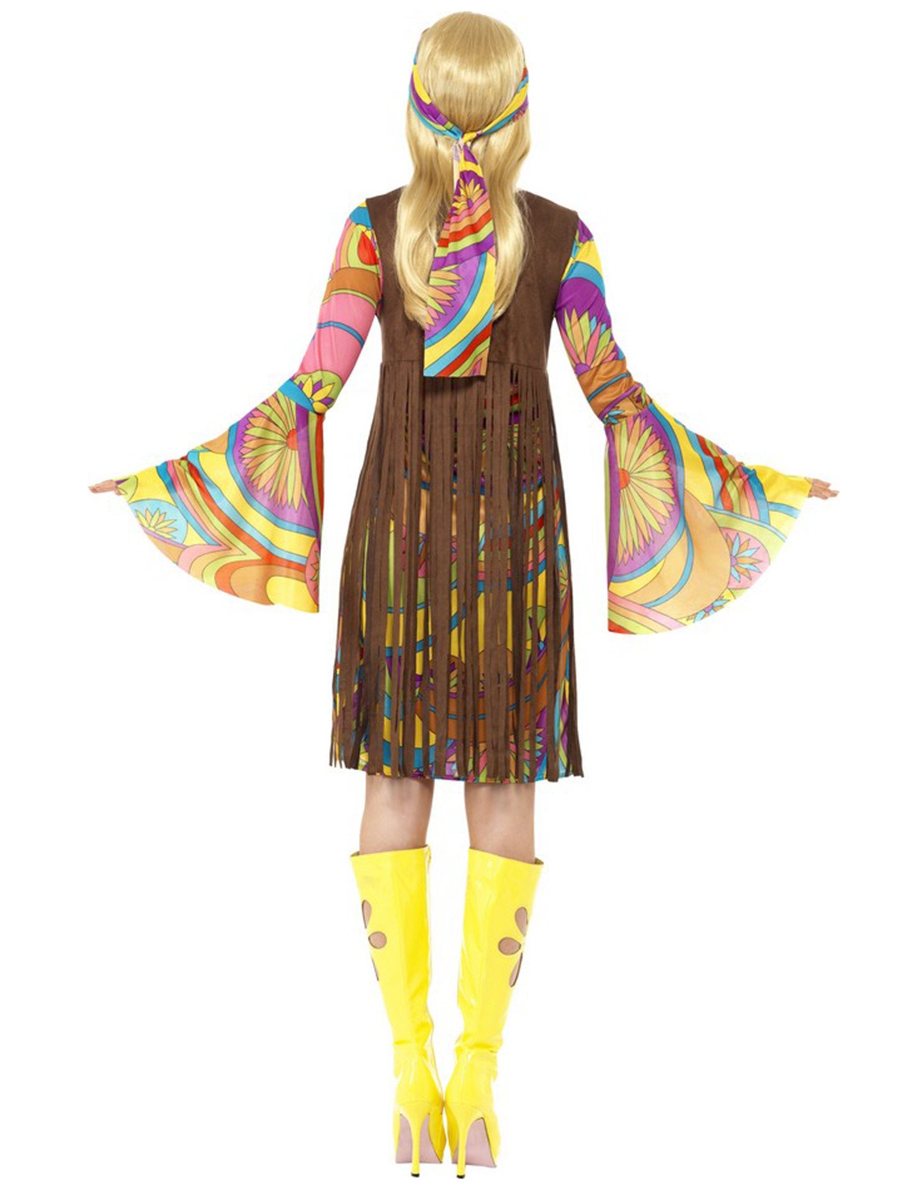 Ovaj hipi kostim za žene sastoji se od vrlo šarene cvjetne haljine, obrubljenog prsluka za stavljanje preko haljine i trake za glavu. Slabani rukavi savršeno će predstavljati stil iz 70 -ih, realizam ovog kostima u potpunosti će vas zavesti. Ovaj set omogućit će vam da se stavite u cipele žene iz ovog poznatog vremena. Kostim hipi cvjeta za žene idealan je za sve vaše večeri na retro temu.