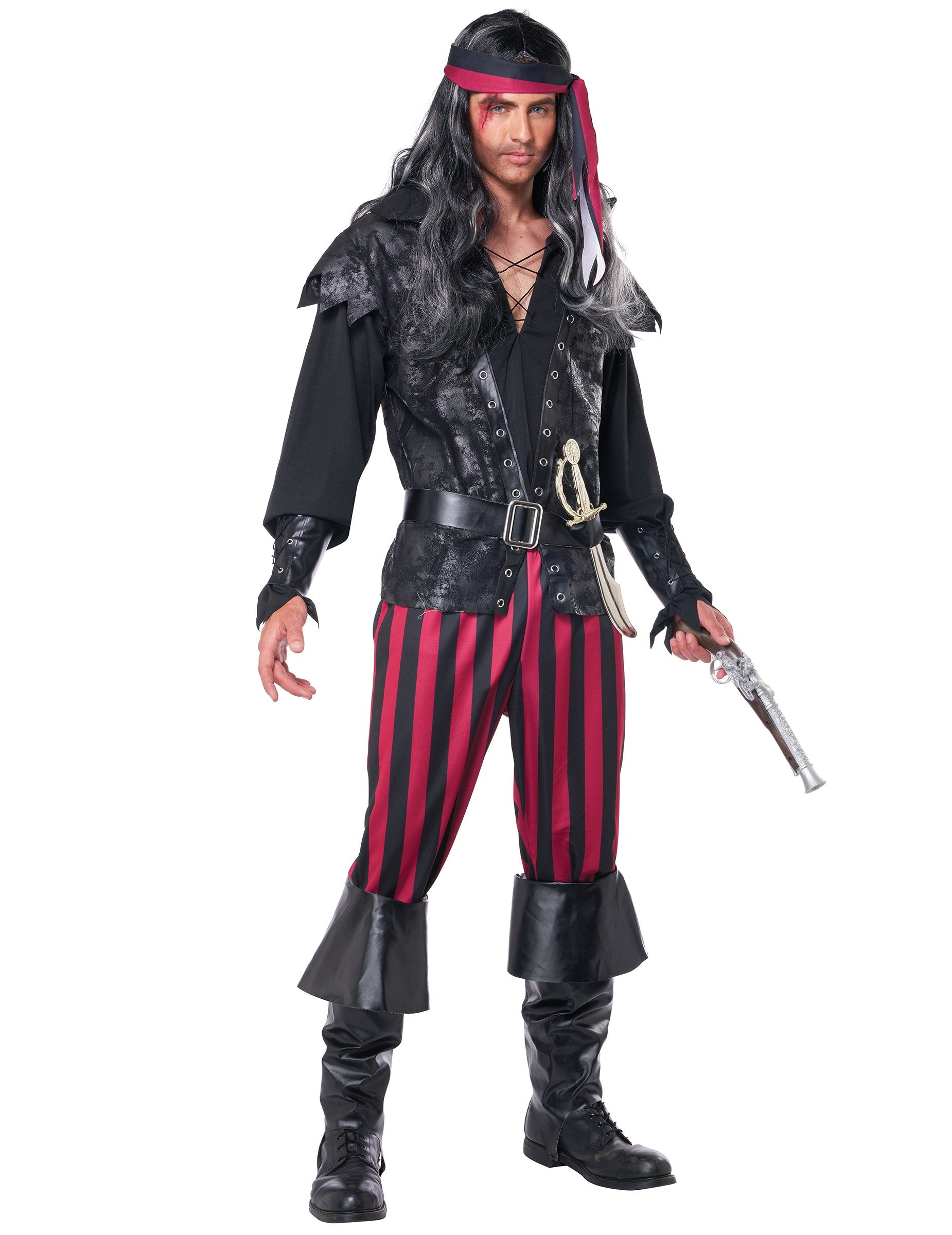 Ovaj gusar prerušen za muškarce sastoji se od vrha s dugim rukavima, pantacourta, 2 manšete, pojasa, 2 čizme i transpareta (sablja i poklopac očiju nisu uključeni). Crni vrh s dugim rukavima ima lažni prsluk s efektom kože s trakama lažne kože na kojima su prisutni. Pantacourt je prugasto crveno i crno. Veličina je elastična za bolju podršku. Manžete su crne u lažnoj koži. Podesit će se zahvaljujući kabelu koji će proći u očima. Podesivi crni remen ima srebrnu plastičnu petlju u boji. Kožne čizme su crne, zadržat će se zahvaljujući elastičnoj proći ispod vašeg stopala. Traka za glavu za vezanje oko glave odgovara Pantacourtu. Ovaj gusarski kostim bit će savršen za tematsku večer ili za karneval.