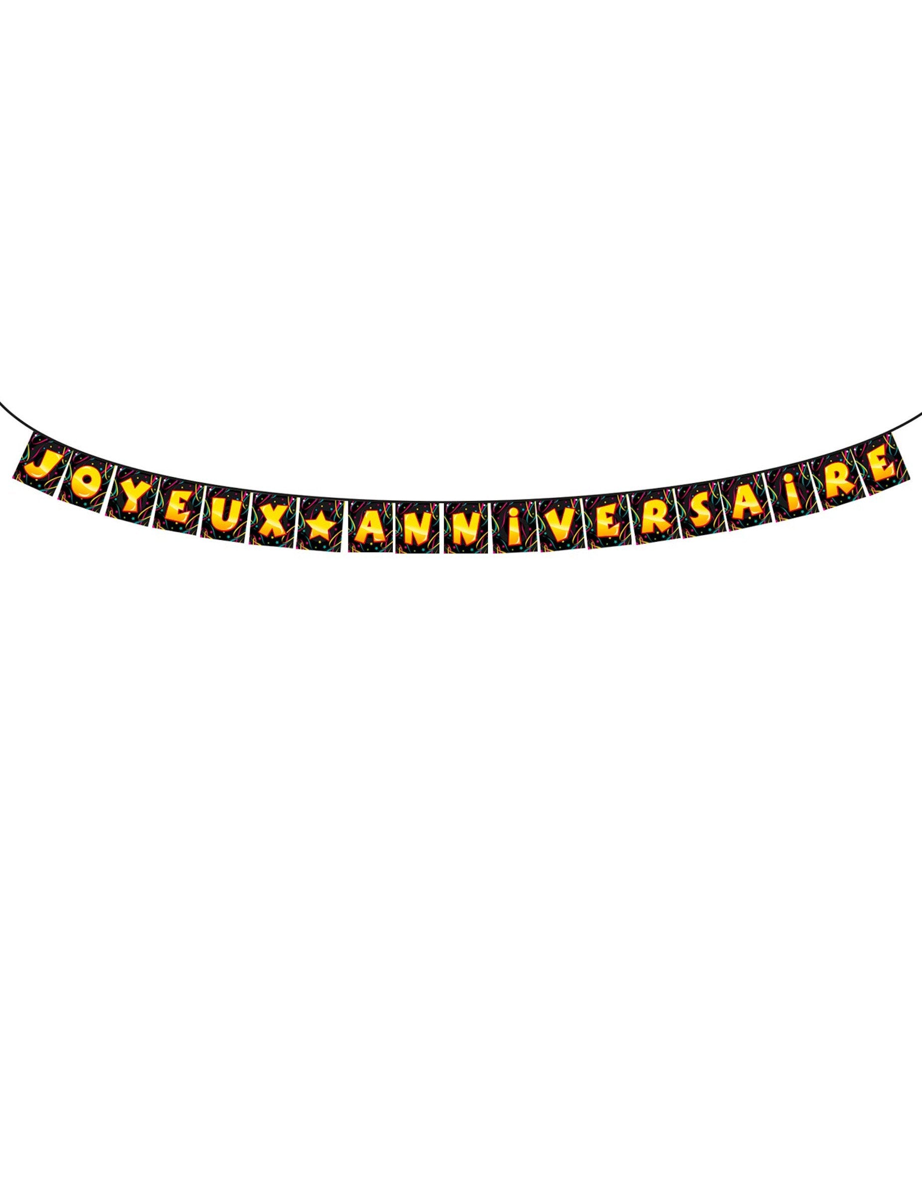 Ova godišnjica Garland -a za ovlaštenja dugačka je otprilike 4 m. Kartonske zastavice koje su obješene na satenskoj vrpci čine riječi "Sretan rođendan". Ove zastavice mjere 15 x 17,5 cm. Na crnoj pozadini, slova se pojavljuju u narančastom -Youllow, a svečana tema vrlo je prisutna zahvaljujući neuspjelim tvornicama ispisanim u pozadini. Pomoću ovog natpisa koji će dovršiti vaš ukras za rođendan, poruka će se sretno preboljeti.