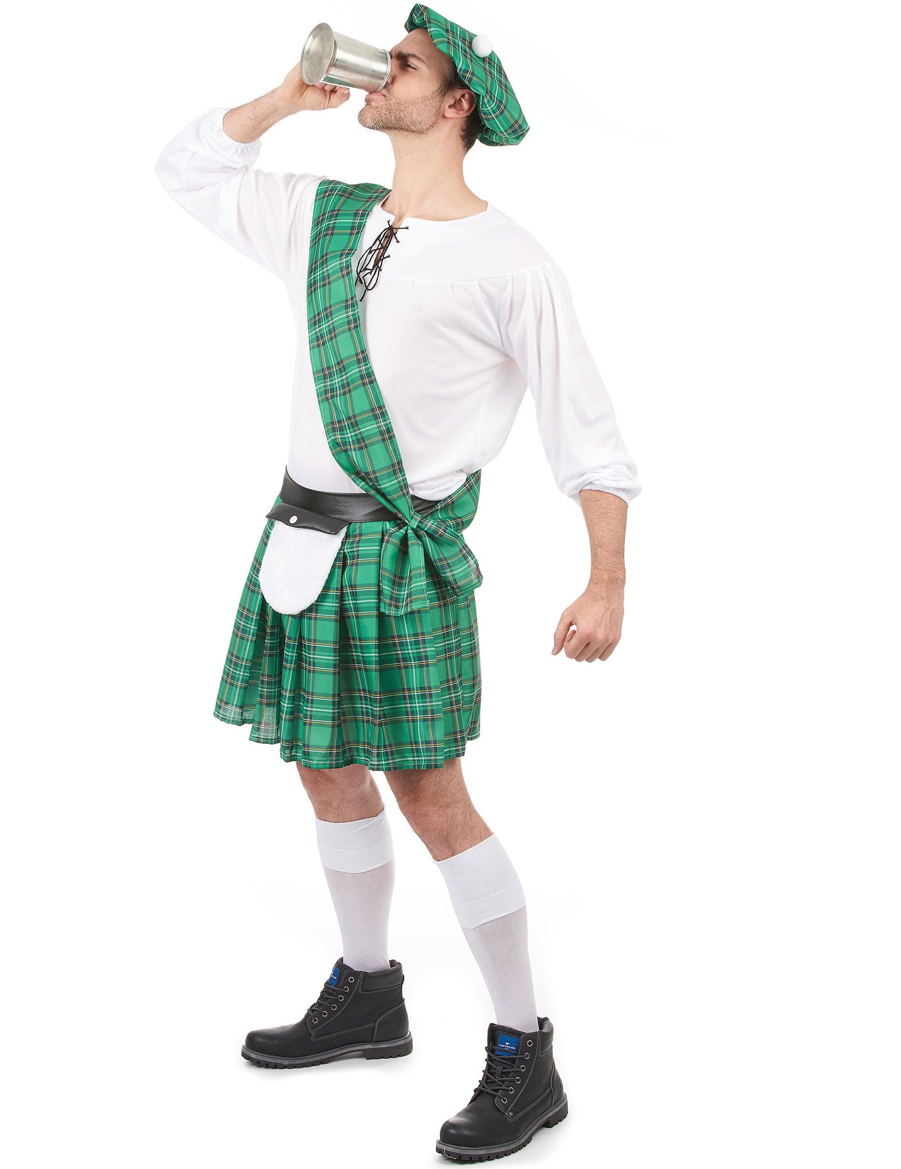 Ovaj kostim za odrasle predstavlja škotski kostim. Uključuje košulju, kilt, šešir i vrpcu (čarape i cipele nisu uključeni). Bijela košulja je dugačka. U poliesteru, kraj rukava ima elastične trake kako bi rukavi bili lagano natečeni. Crna čipka zatvara vrat. Nosit će se u kiltu na tradicionalnom tartanskom motivu. Ova suknja ukrašena je crnim remenom i malom vrećicom na prednjoj strani. Šal doista tartan vezan je po torzu. Beretka koja odgovara kiltu naginje se u glavu. Bijeli pompe krasi ovaj Tam O'Shanter tipičan za tradicionalne društvene kostime. Tijekom prerušene večeri, pretvorite se u pravog Škotskog.