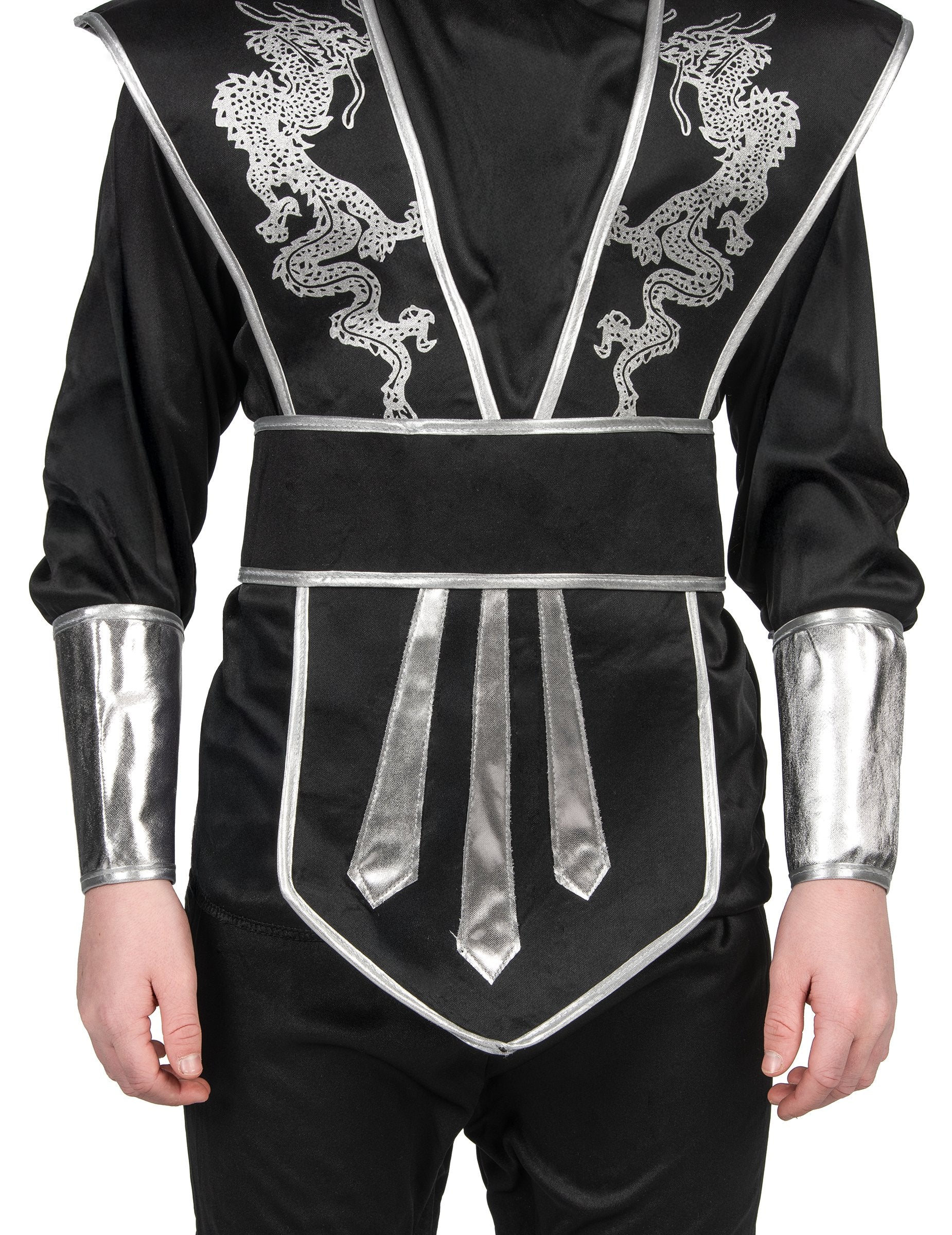 Ovaj ninja kostim je za dječake. Sadrži majicu, štitnik za prsa, hlače, remen, tajice, rukave i kapuljaču. Majica je crne boje, kopča se na čičak traku iza vrata. Dugi rukavi prekriveni su srebrnim manšetama koje se pričvršćuju čičak trakom. Srebrni obrub prati obrise tkanine. Na bočnim stranama prsnog oklopa otisnuta su dva srebrna zmaja. Široke crne hlače imaju elastični pojas za dobro pristajanje. Potkoljenice se mogu držati srebrnim grijačima za noge na čičak. Preko prsnog oklopa i hlača nosit će se crni pojas koji se također kopča na čičak. Kapuljača je crna. Potpuno prekriva glavu i ostavlja vidljive oči i nos. Za karneval ili rođendansku zabavu vaš mali dječak može pokazati svoje ninja vještine.
