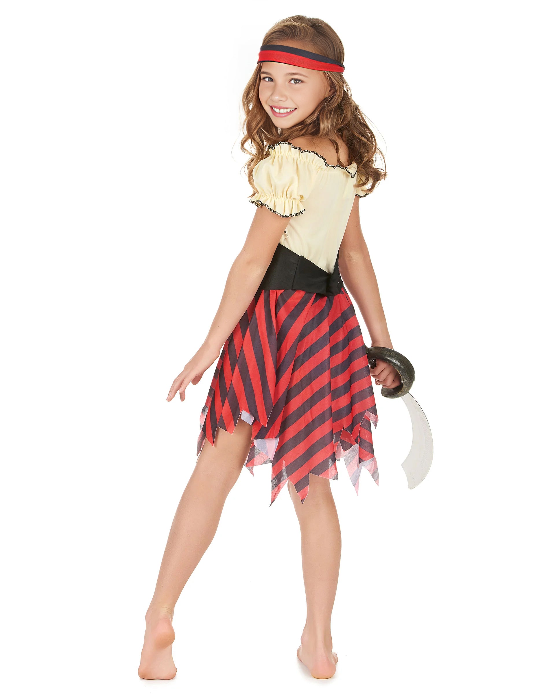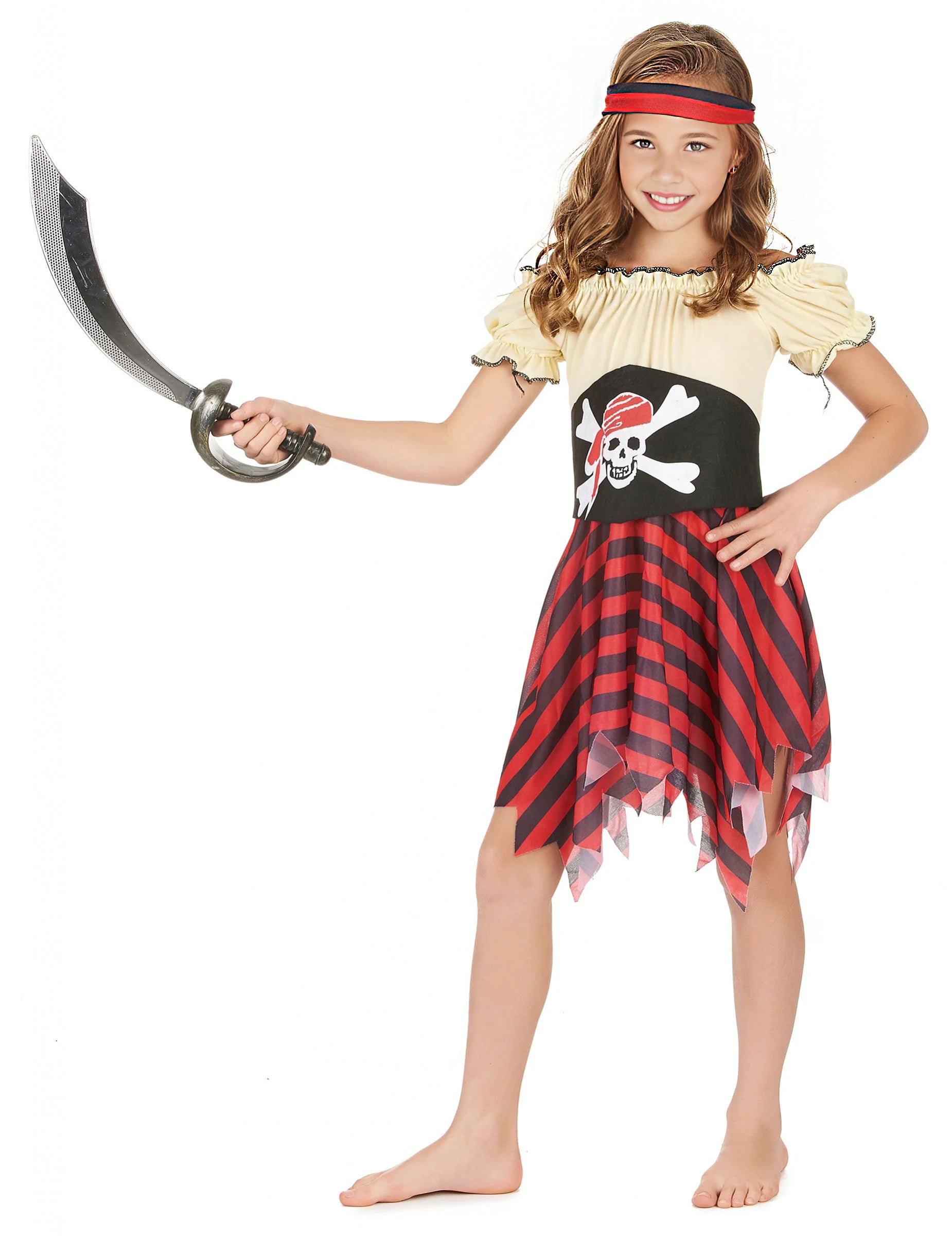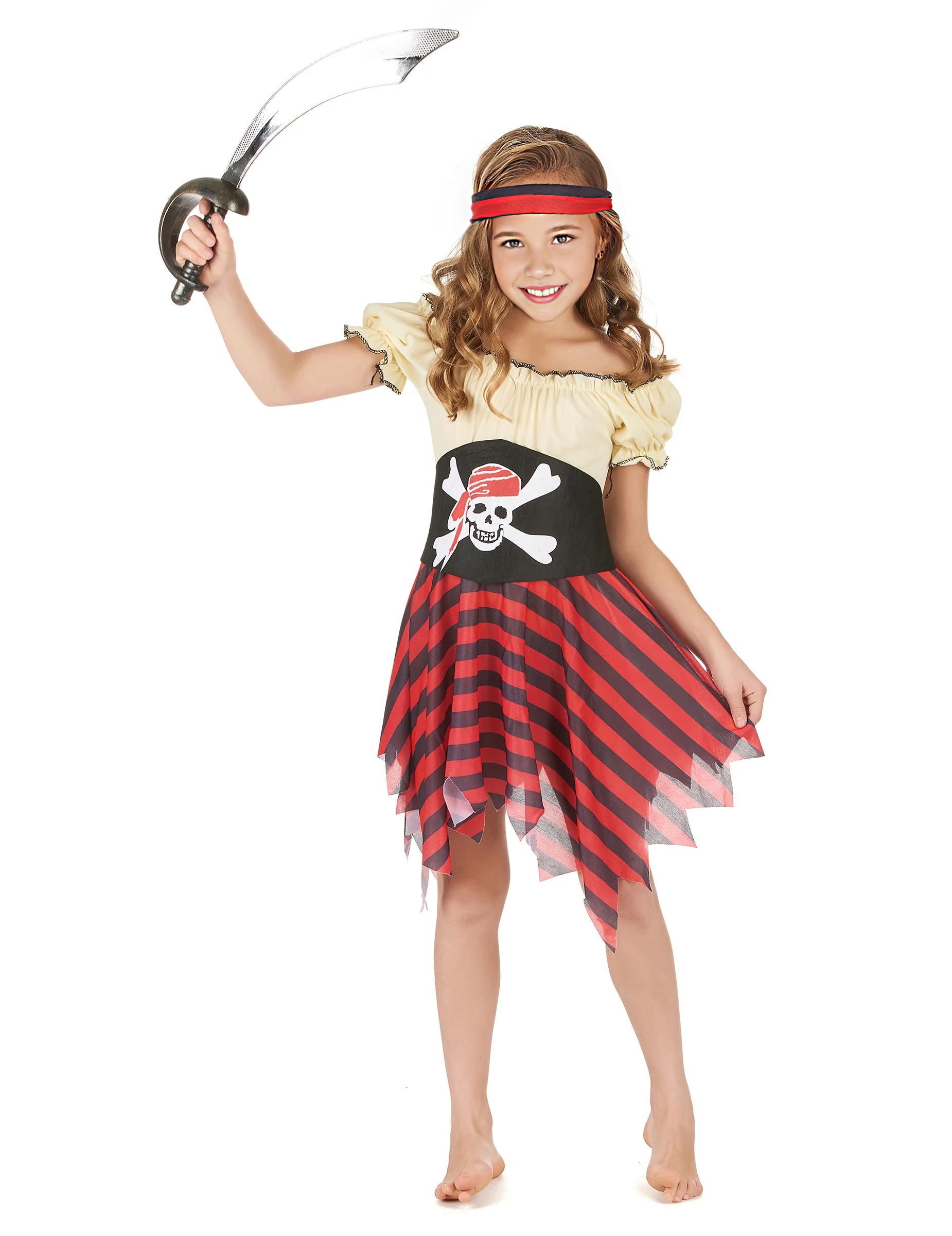 Ovaj gusarski kostim namijenjen je djevojci. Sastoji se od haljine, pojasa i transpareta (sablja nije uključena). Vrh haljine je žut s kratkim rukavima je natečen. Na dekolteu i rukavima vidljivo je crno šivanje. Petticoat je dva kolora. Crvene i crne vodoravne pruge ukrašene su učinkovitim učinkom s rezanjem vrhova s dna suknje. Široki pojas ističe veličinu. Poznata lubanja crtana je na središnjem dijelu. Traka za kosu je dva tona. Tijekom prerušenog rođendana, vaša će kći biti savršen rascal mora.