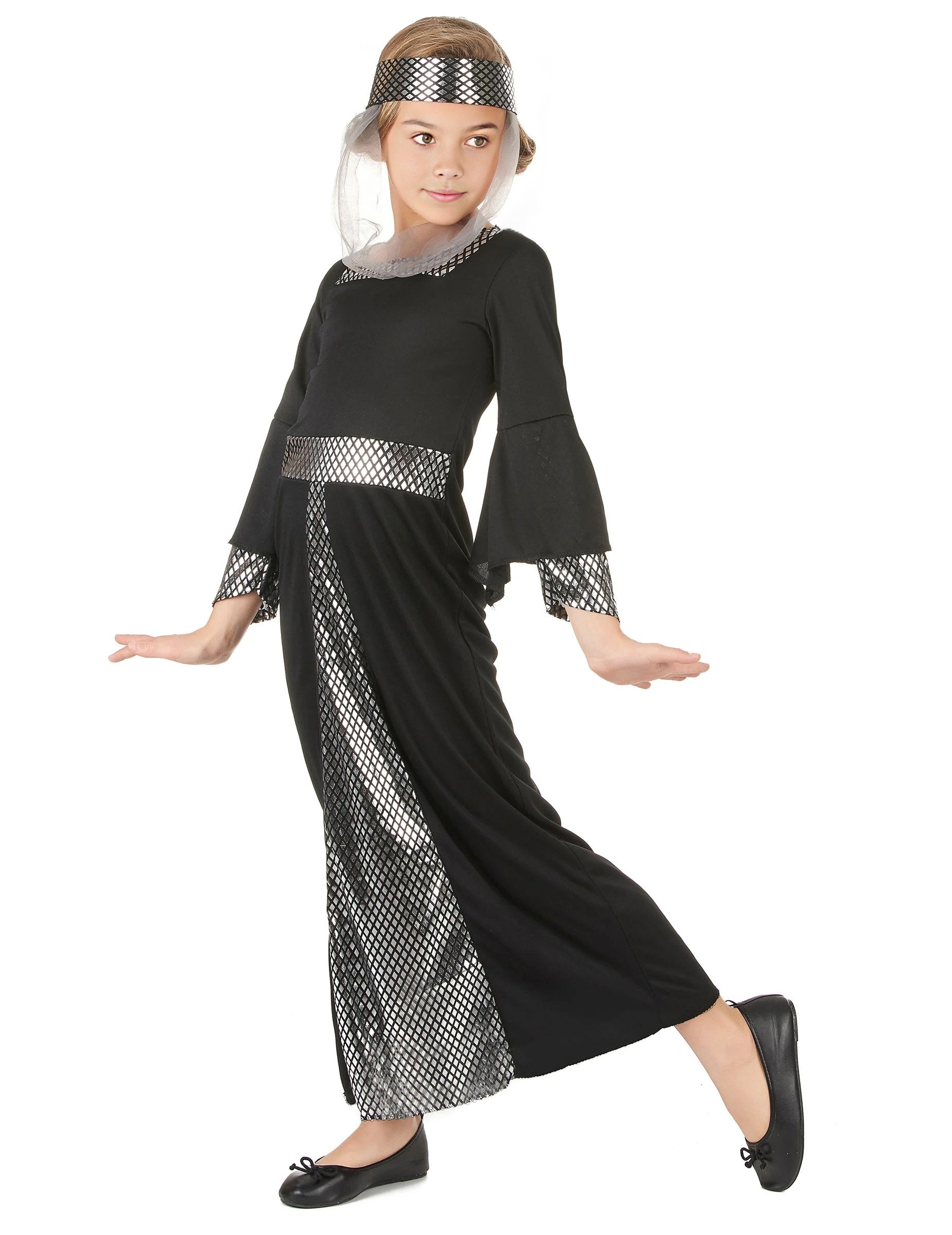 Ovaj prerušavanje djece evocira srednjovjekovnu princezu srednjeg GE -a. Uključuje haljinu i transparent (cipele nisu uključene). Oštrica poliestera uglavnom je crna. Kvadratni ovratnik ističe se tkaninom koja oponaša vikendicu mreža. Remen je podvučen tom istom tkaninom, baš kao i rukavi i središte haljine. Crne rufice daju labav učinak rukavima. Ova haljina će se nastaviti po glavi. Natpis ima malu elastiku i predstavlja glavu koju je nosila dama tog vremena. Sivi veo je fiksiran na stranama. Tijekom kostim rođendanske zabave ili karnevala, vaša će kći biti lijepa u srednjovjekovnoj šteti.