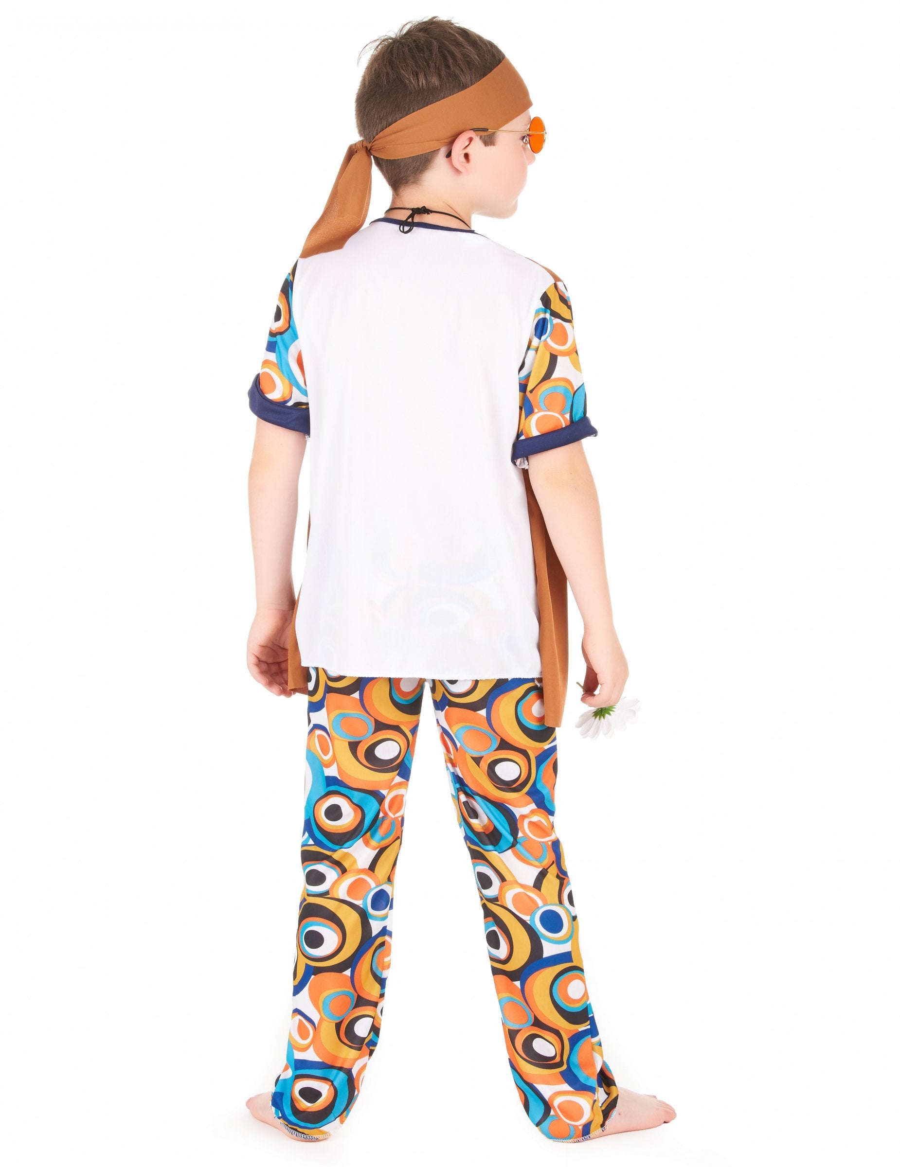 Ovo dječije prerušavanje oponaša stil 60-ih. Majica je bijela. Smeđi prsluk šiva se na ramenima, a kratki rukavi imaju psihodelične motive. V -noka je istaknuta crnom granicom. Hlače su obilne. Višebojni okrugli uzorci izražavaju temu 60 -ih. Traka za glavu je smeđe boje. Privjesak je dobro poznati simbol mira i ljubavi ovog vremena. Organizirate tematsku zabavu hipi, vaš će dječak biti potpuno brz s ovim kostimom.