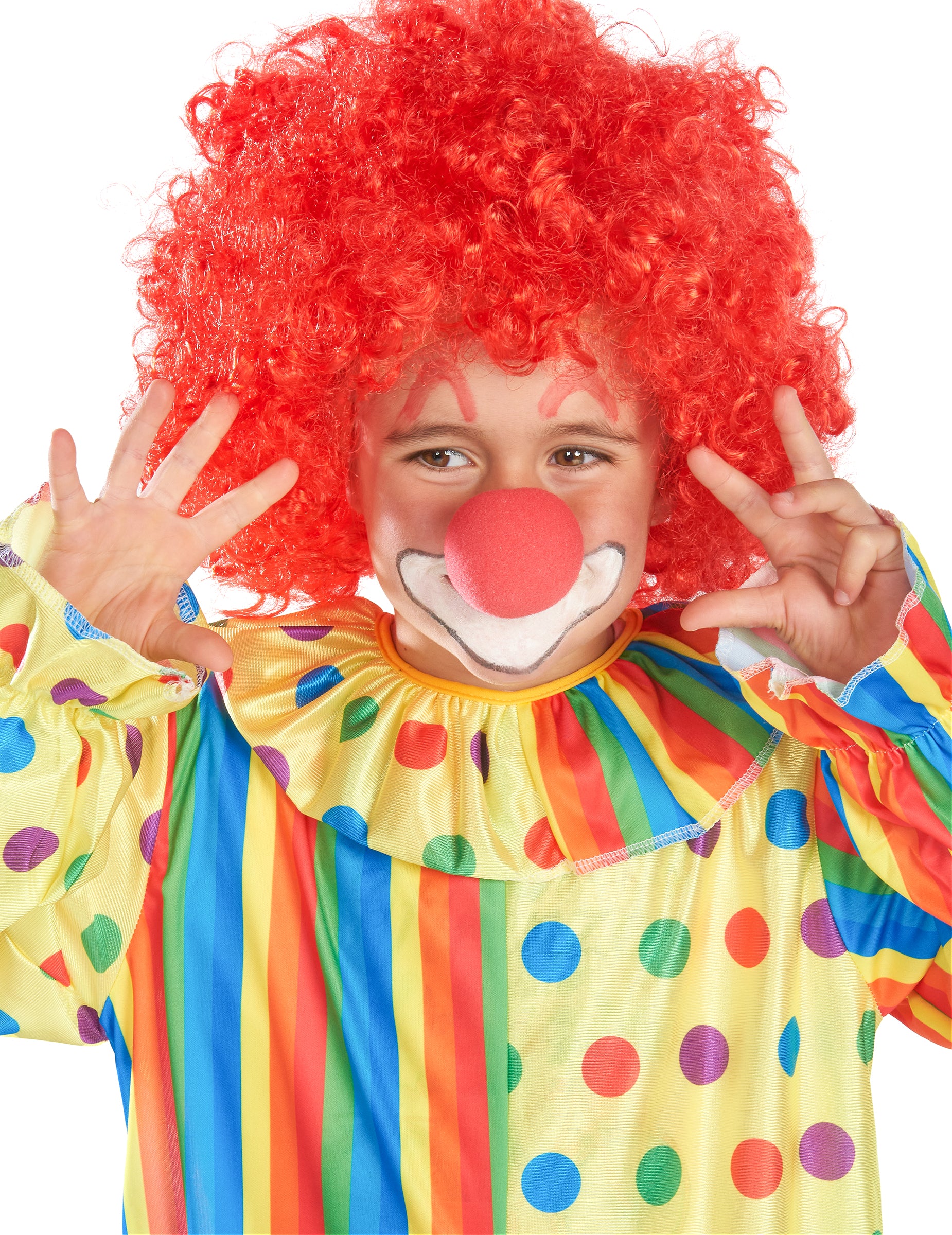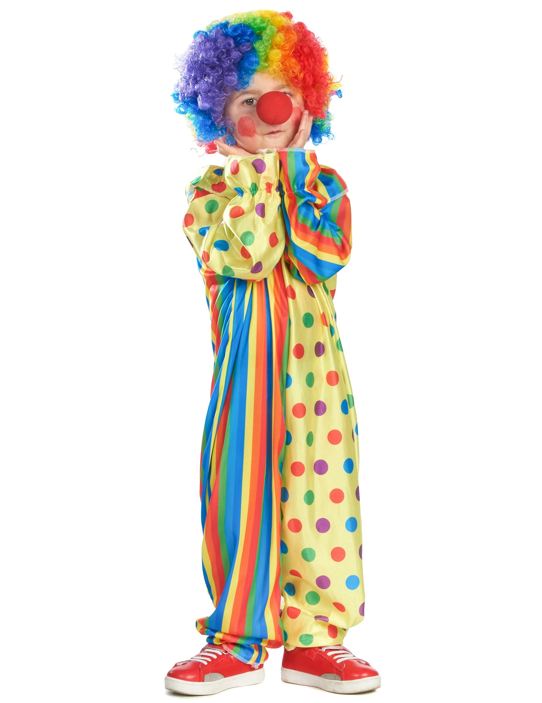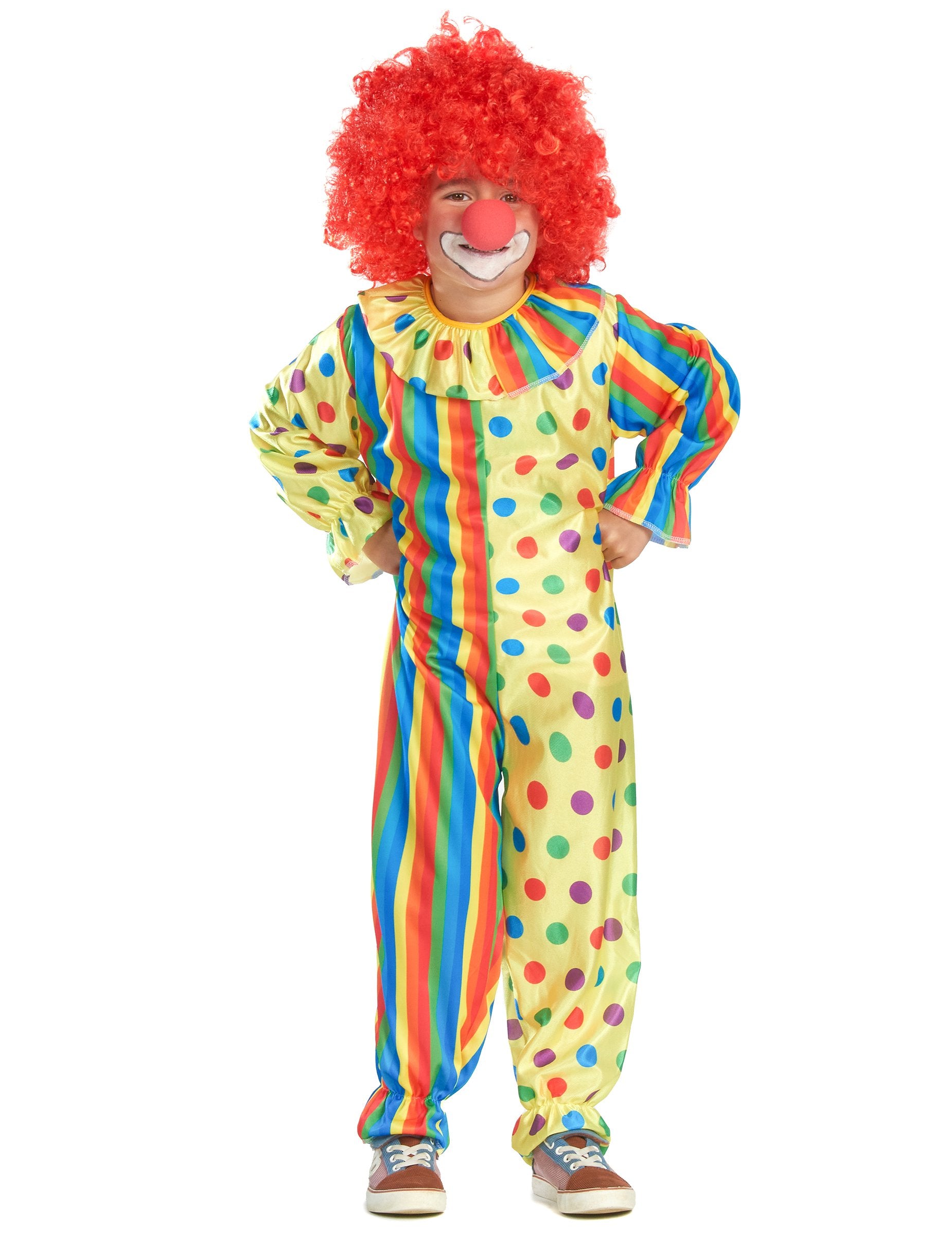 Ovaj kostim za djecu uključuje kombinaciju (perika i čarape nisu uključene). Kombinacija je raznobojna. Predstavlja dva različita stila uzoraka. Okomite pruge se izmjenjuju s graškom. Tkanina od polka dot ima lagano sjajan učinak, što je u suprotnosti s neprozirnom stranom prugaste tkanine. Cijela daje vrlo šareni učinak. Dno rukava i nogu zadržava elastiku kako bi se stvorio natečen učinak. Ova se kombinacija zatvara straga pomoću ogrebotine. Za karneval stavite ovaj kostim svom djetetu i za jednom će imati pravo učiniti klaun.