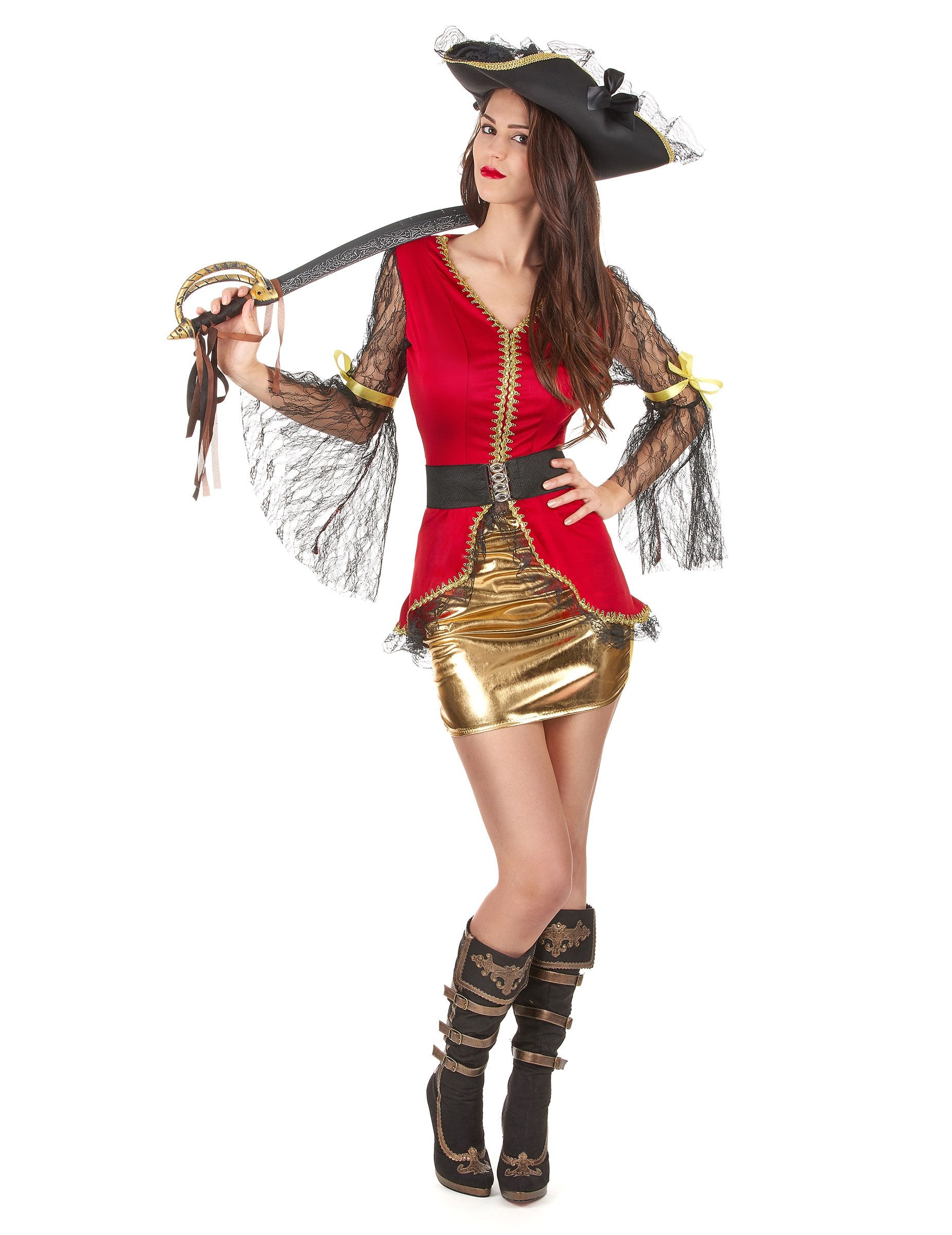 Ovaj kostim za odrasle predstavlja seksi gusar. Uključuje jaknu, suknju, pojas i šešir (cipele i sablja nisu uključeni). Jakna je crvena. Šavovi su zašiljeni zlatnim ukrasima. Crna čipka šiva se po dnu jakne, prisjećajući se rukava. Kratka suknja je zlatna. Crni pojas omogućuje vam da držite plakovu jaknu na suknji. Crni šešir ima oblik klasične trikorne filibusira. Zlatna granica i crna čipka elegantno dovršavaju ovaj kostim. Tijekom večeri na morskoj temi ili Bandit stavio je ovaj hakerski kostim i pjena na moru.
