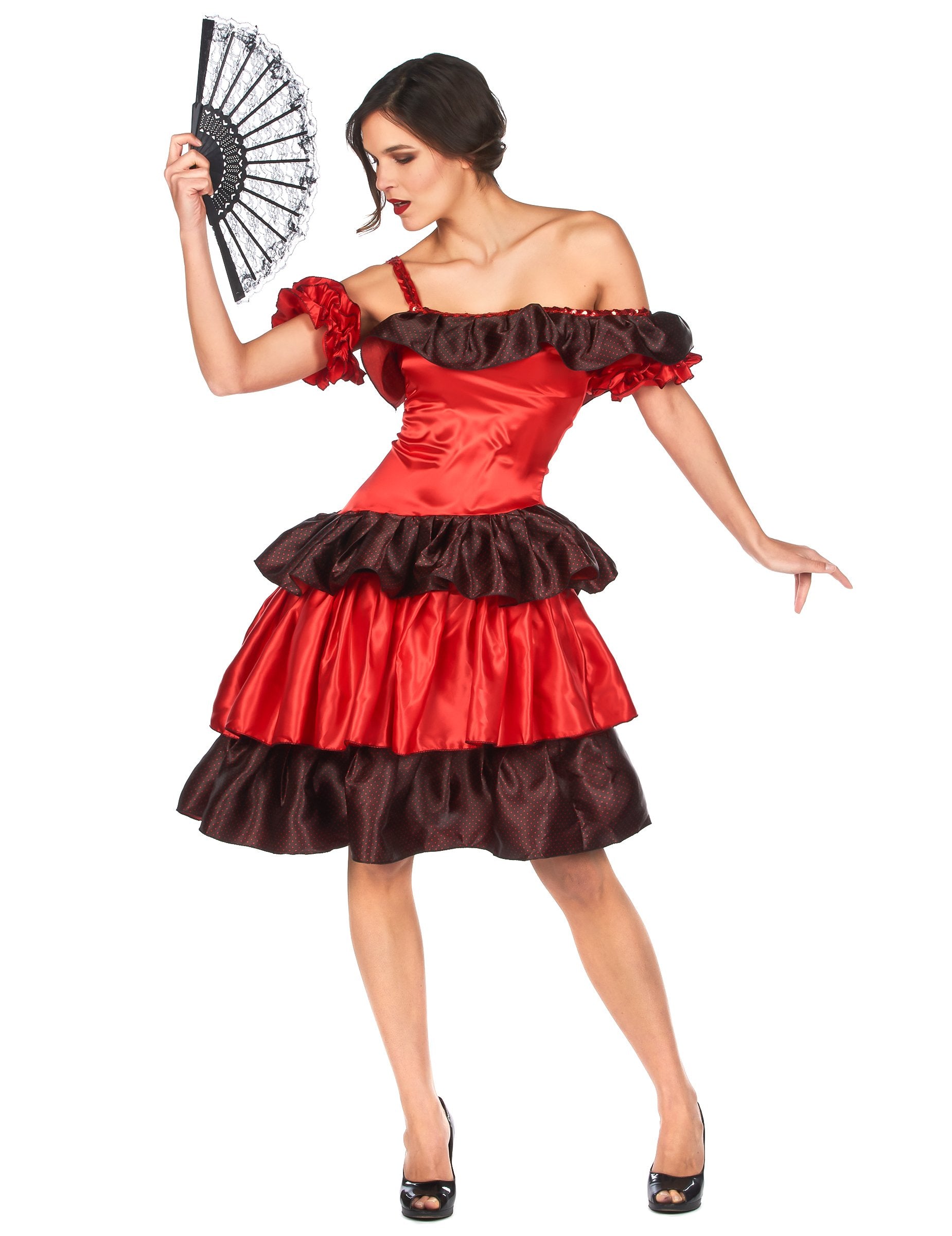 Ovaj kostim za odrasle evocira andaluzijskog plesača. Uključuje haljinu, trake za ruke i kopče za kosu (cipele nisu uključene). Haljina je dva tona. Sastoji se od nekoliko pjenušavih crvenih i crnih crvenih rufa. Ovratnik je asimetričan s jednom rampom. Crne i crvene ruke u obliku elastike kose trebaju se staviti na ruke kako bi se dovršila ova odjeća. Klipute od crne kose nadvladaju pjenušavi crveni cvijet poliestera. Tijekom latinske večeri ili za karneval zapalite sobu sa španjolskim plesovima!