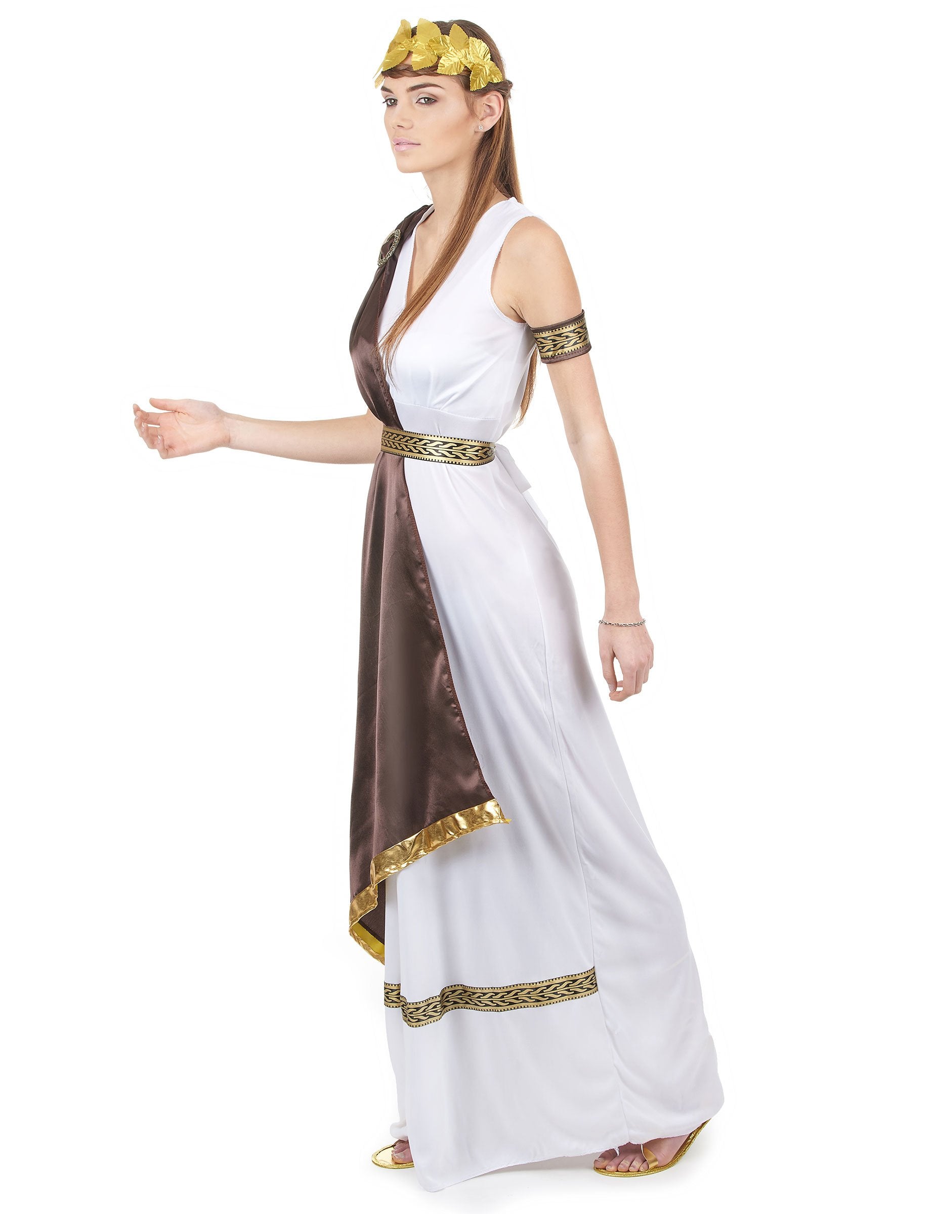 Ovaj kostim za odrasle je ilustracija drevne odjeće. Uključuje haljinu s listom, remenom, trakama za ruke i trakom za glavu za kosu (nije uključene cipele). Haljina je bijela u finoj tkanini. Dugo je i crno i zlato vez za šivanje na dnu. Pojas koji je malo visok ima iste uzorke. Satenski smeđi ogrtač pričvršćen je na rame, a plastična petlja zlatne boje ukrašava prsa. Dvije poliesterske trake imaju smeđu bazu, a uzorci slični pojasu su šivani iznad. Zatvaraju se ogrebotinama. Bijela plastična traka za glavu nadvladava zlatnim listovima. Nosite kostim ove dame tijekom večeri na rimskoj ili grčkoj temi.