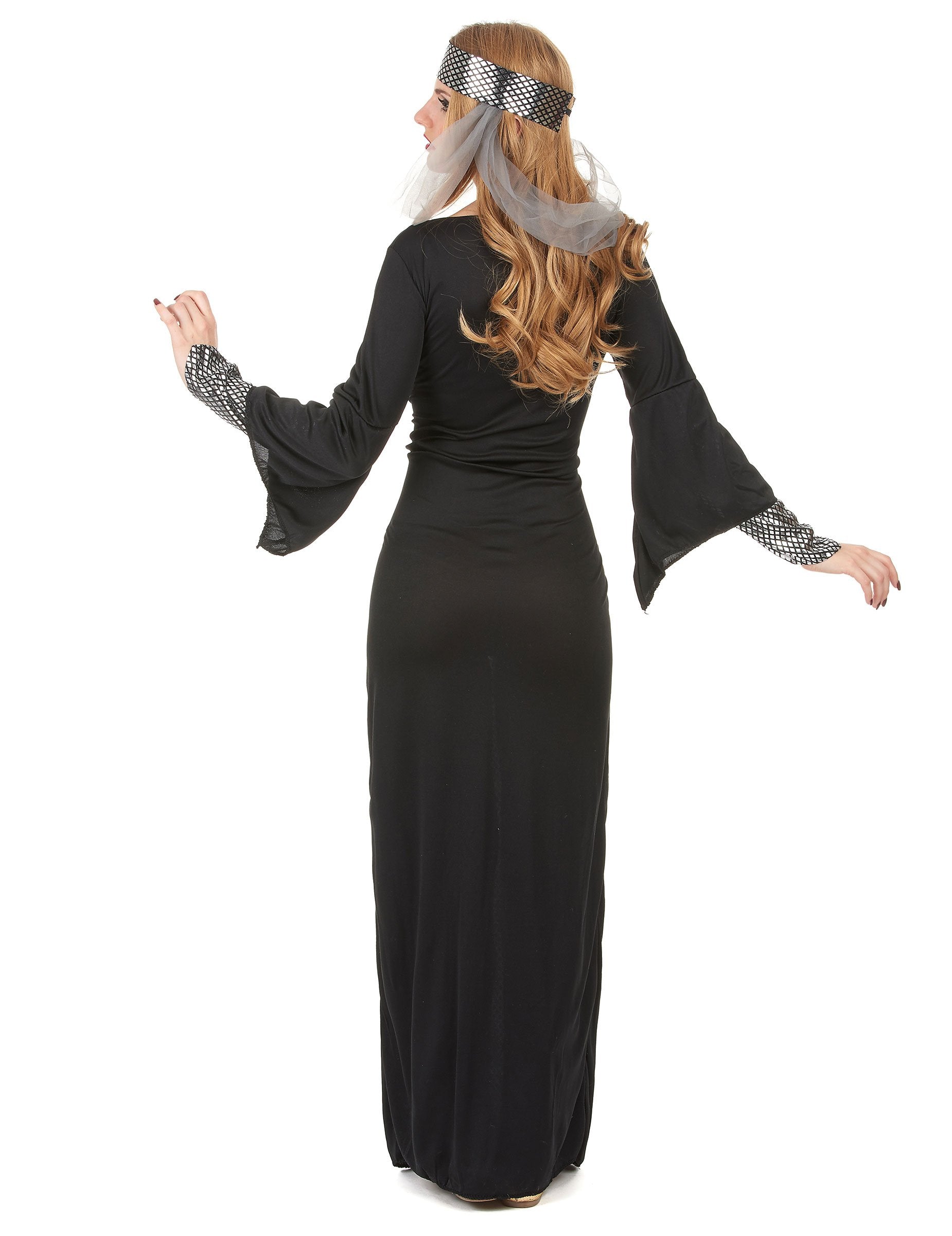 Haljina od poliestra je crna. Blago je sužena u struku i ima široke rukave. Srebrni detalji u području struka, ovratnika i rukava podsjećaju na lančanu košulju iz tog doba.