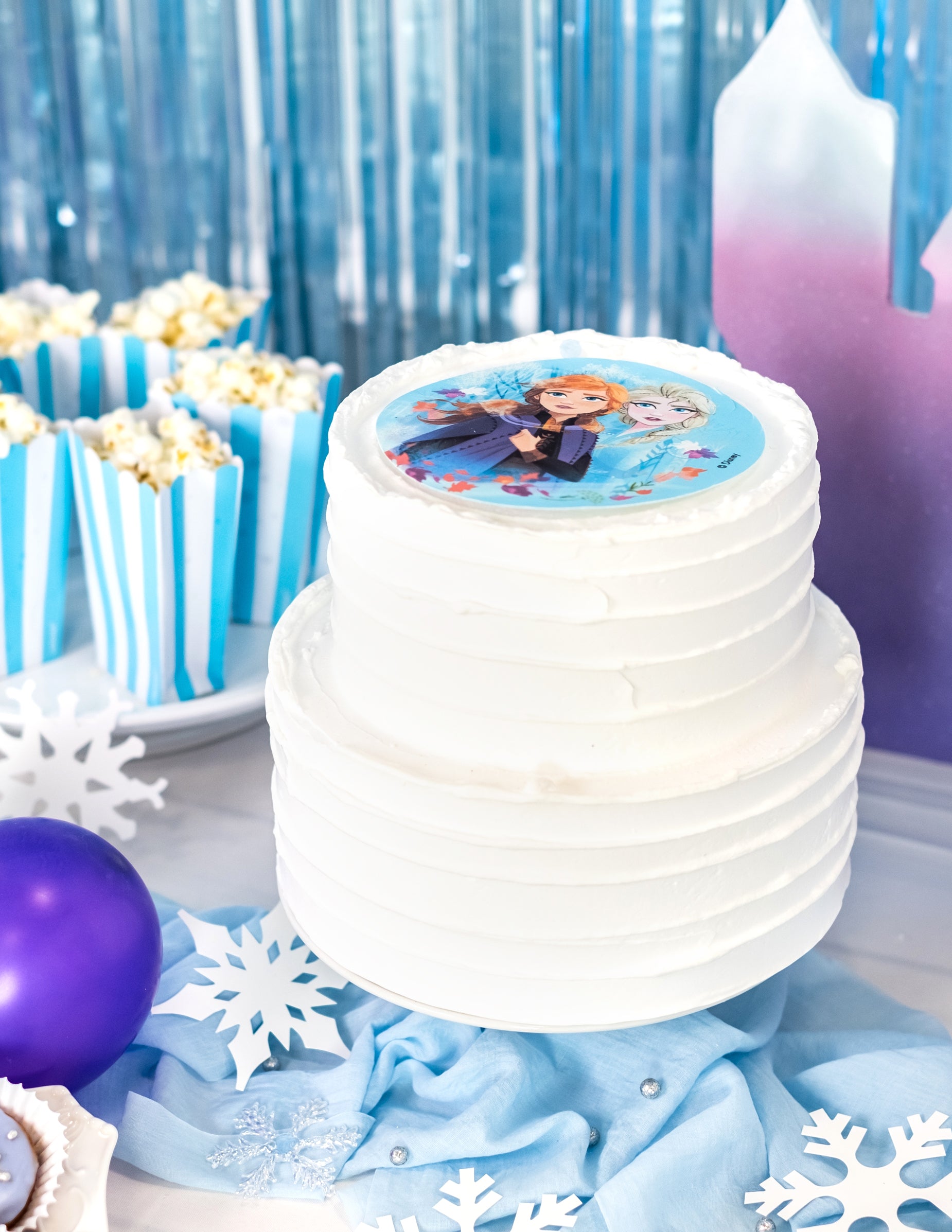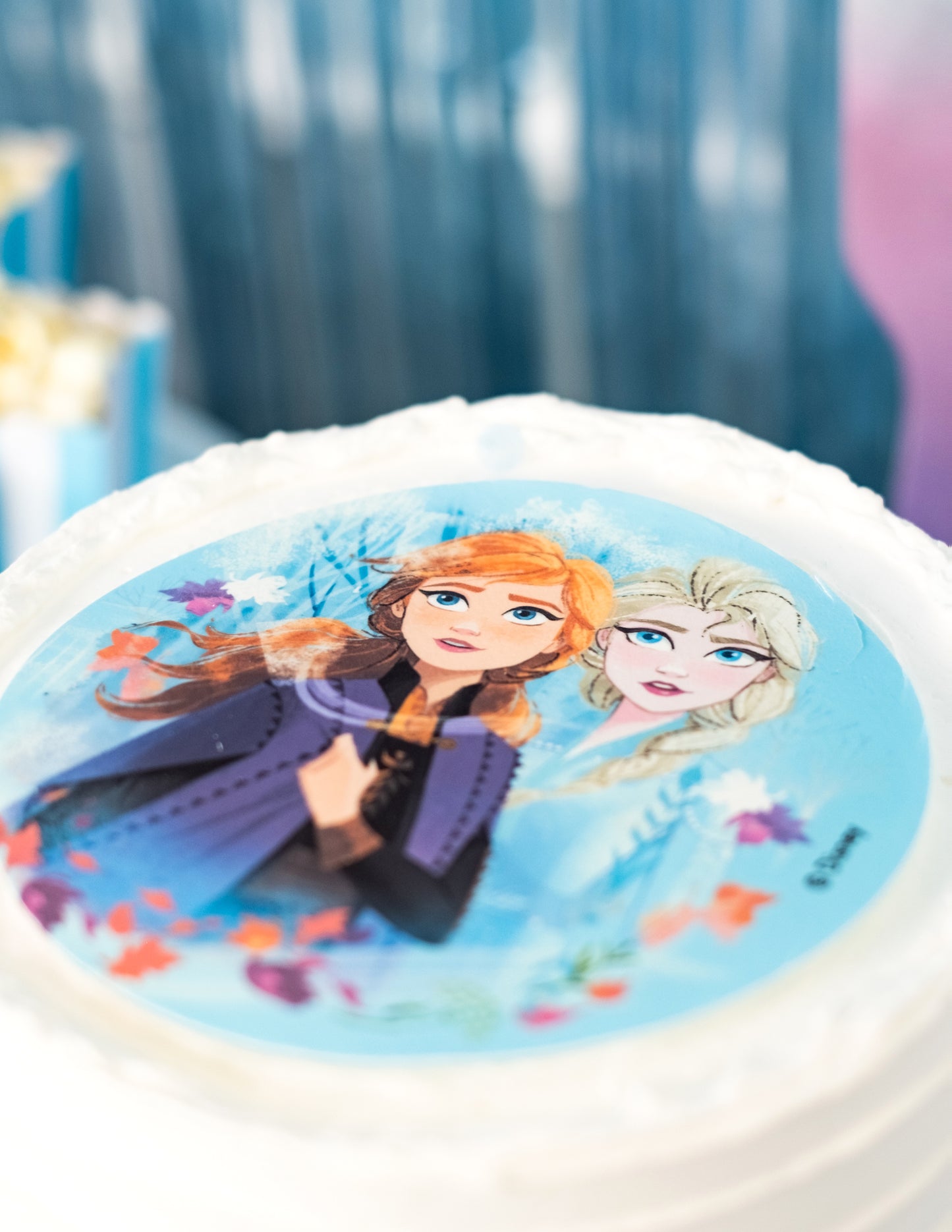 Ovaj šećerni disk je pod službenom licencom Snježna kraljica 2. mjeri promjera 16 cm i predstavlja Elsu i Anna Frozen. Ovaj će ukras biti savršen za rođendan na temi Disney Frozen. Sastojci: modificirani kukuruzni škrob, šećer, voda, e414, e460i, okus vanilije, boje.
