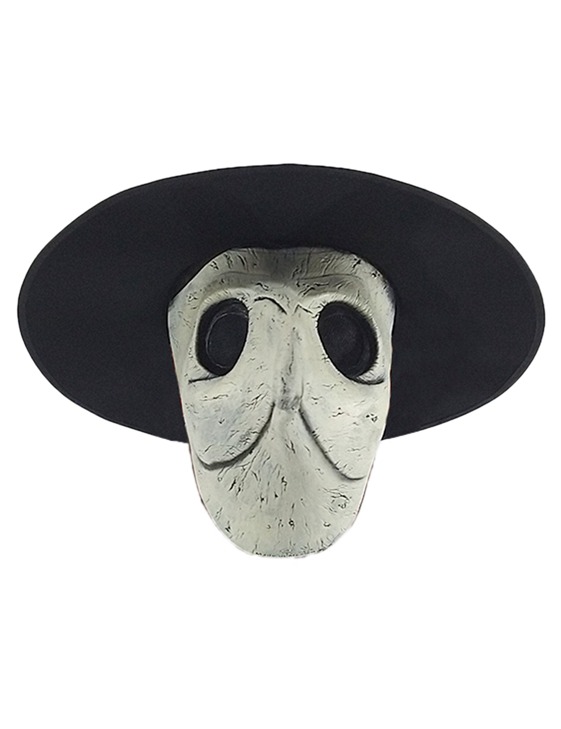 Ova odrasla poluvremena evocira zaštitu koju su imali liječnici vremena kuge. U sivom bijelom lateksu oslikana je ručno. Oči su materijalizirane debelim crnim krugovima. Crna mreža omogućit će vam da vidite kroz ove otvore, a da ne vidite oči. Na razini nosa prisutno je izbočenje u obliku kljuna. Svrha ovog obrasca bila je držati loše mirise. Ova maska za pola održavat će se u licu pomoću elastike. Za temu ili večer za Noć vještica, uplašite svoje prijatelje noseći deguise kao kugu.