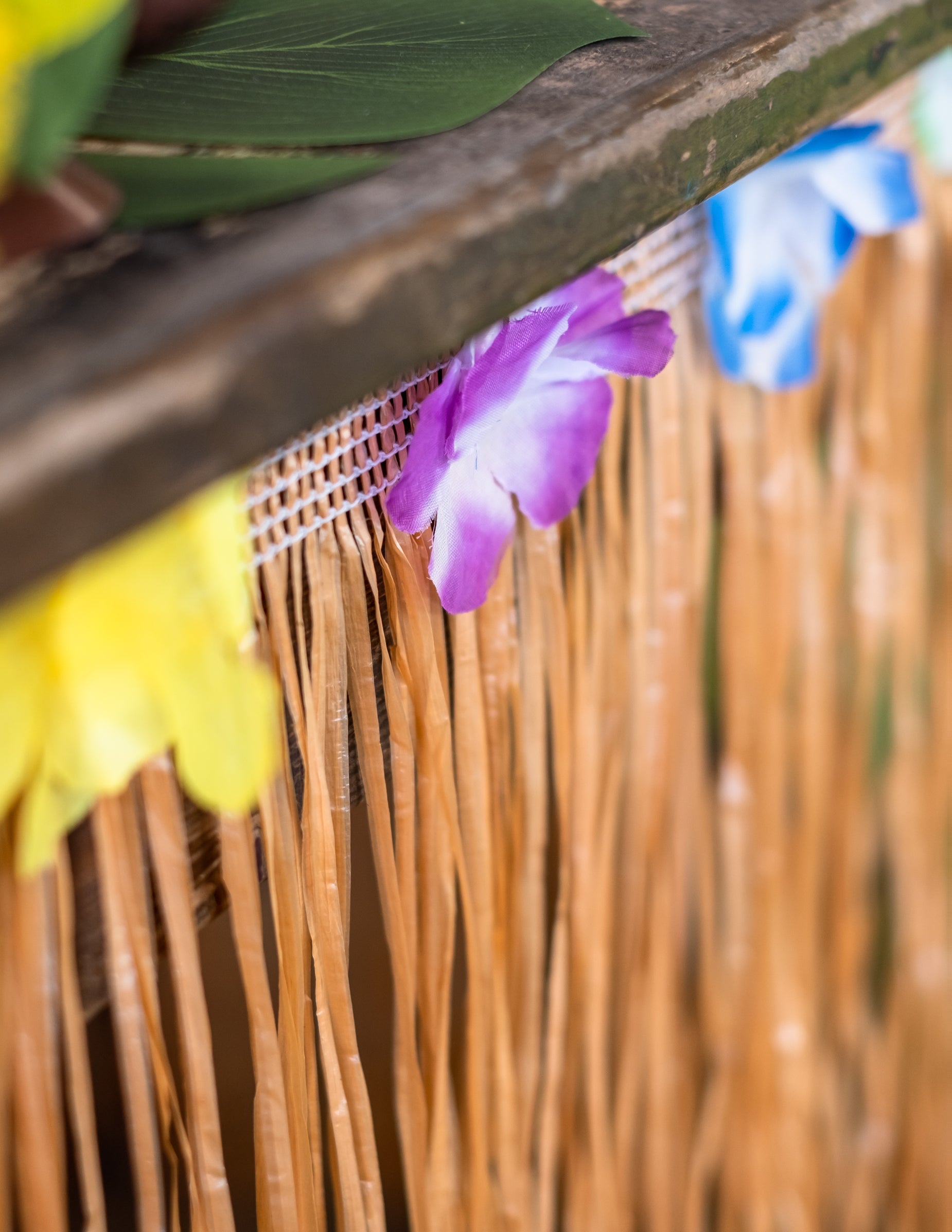Ova suknja stola je bež. Poput prerušavanja, i ovaj krug stola ima vrpce u imitaciji Raphia. Na vrhu su egzotični cvjetovi u raznim bojama fiksirani na cijeloj turneji. Ovaj ukras mjeri 2,74 m dugačak s vrpcama od 71 cm. Za večer tema na Havajima ova će suknja stola biti savršena za uspješnu egzotičnu atmosferu.