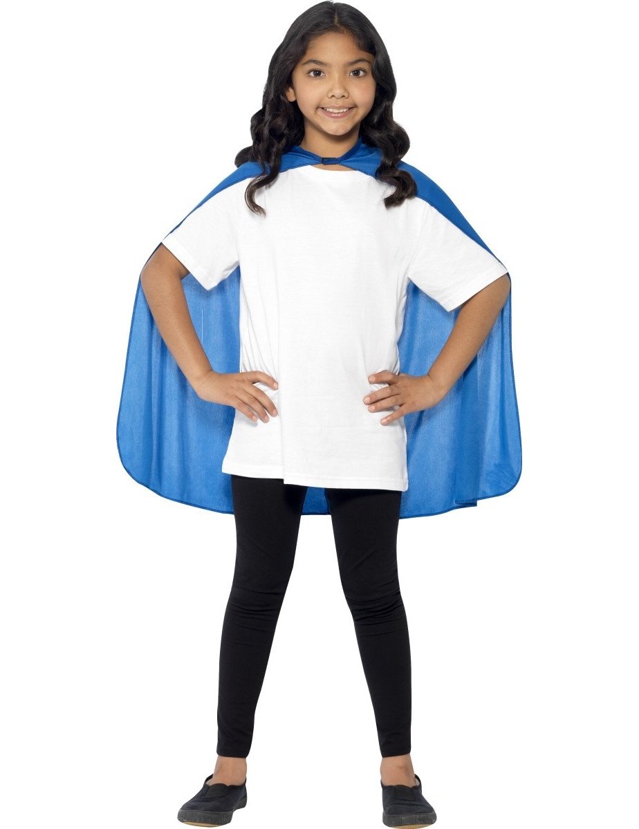Ovaj dječji ogrtač je plavi. Mjeri oko 65 cm duljine. Ovaj se ogrtač zatvara prednjim dijelom ogrebotinama. Ovaj mali plavi ogrtač bit će savršen za dovršavanje vašeg kostima superheroja za karneval.