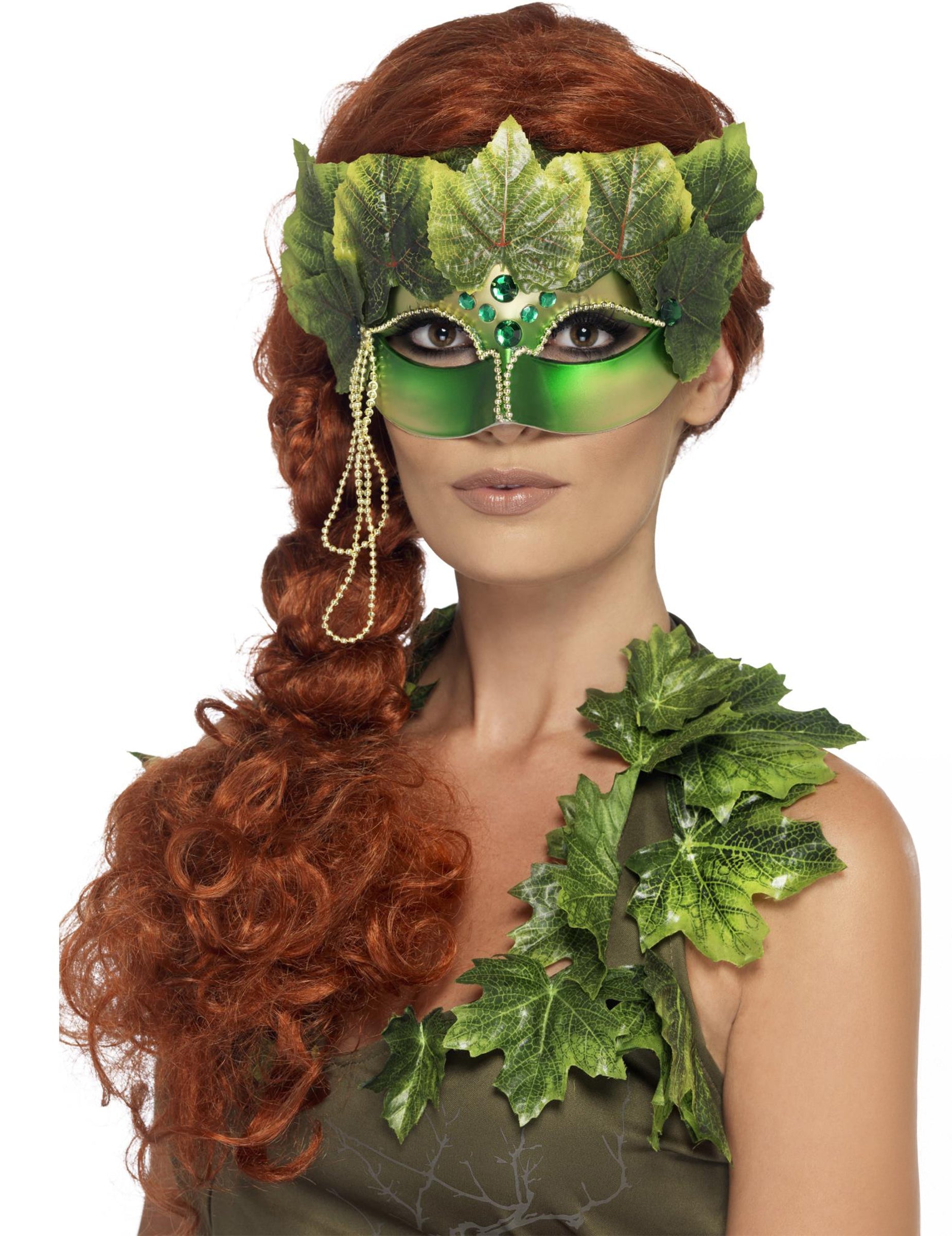 Ova zelena i zlatna maska nimfe izrađena je od plastike. Lijepo je ukrašen plastičnim zelenim pjenušavim biserima. Zlatni biseri dolaze ukrašavati obris oka i nosa i lagano padaju s desne strane. Farandol lišća krasi vrh maske. Crna vrpca postavljena na stražnjoj strani omogućuje vam da je pričvrstite prema veličini glave. Ova maska nimfe bit će savršena za pristup prerušavanju tijekom tematske večeri ili karnevala.