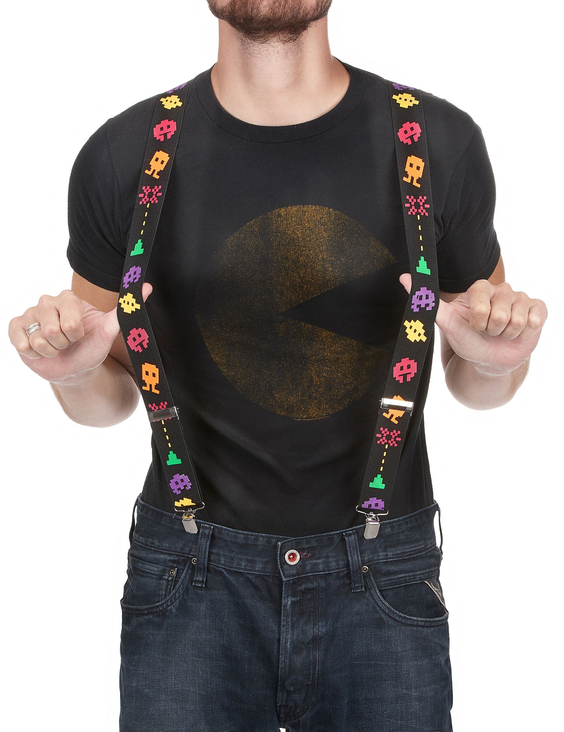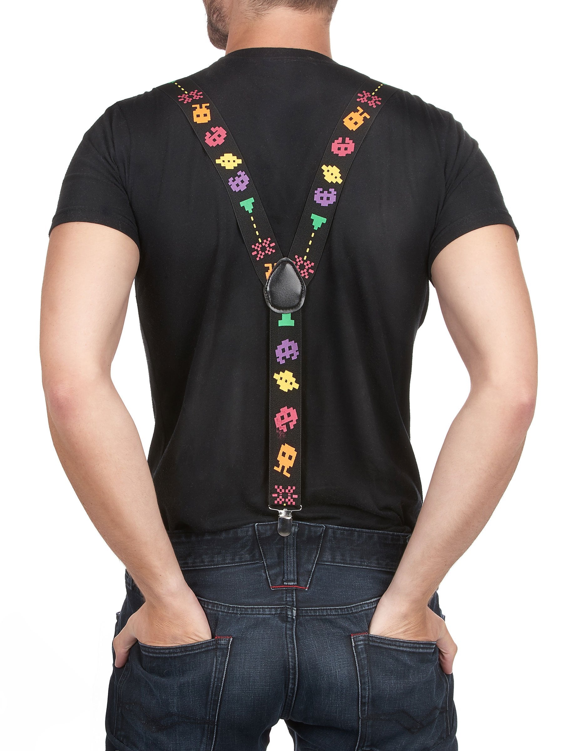 Ovaj retro dodatak dostupan je u jednoj veličini. Ove su trake crne boje i ispisane s pikseliranim likovima iz poznatih videoigara iz 80 -ih. Retro igračka večer? Bit ćete savršeni s ovim suspendovima!