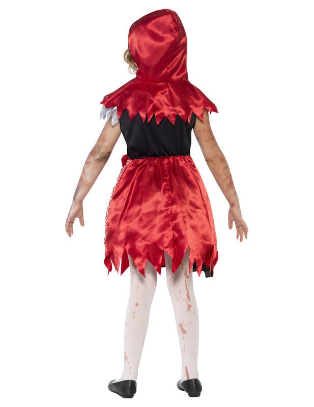 Ovaj zombi zombi kostim za djevojčicu sastoji se od haljine i mini ogrtača s kapuljačom (tajice i cipele nisu uključeni). Haljina ima lažno crveno vezanje na prednjoj strani, čiji dio nedostaje. Granica crvenih šljokica krasi pola vrata. Dno haljine, sateno crveno, prekriveno je bijelom i crvenom kariranom tkaninom. Veliki dio dna haljine izrezan je u vrhu. Ostalo je zajedno s crnim satenskim transparentom. Za više udobnosti, stražnji dio haljine je elastičan u struku. Ogrtač s kapuljačom je crvena, u satenskoj tkanini. Izrezana je na točke i zatvara se sprijeda pomoću ogrebotine. Ovaj zombi crveni kostim bit će savršen za zastrašujuća prijateljica na večeri Noći vještica.