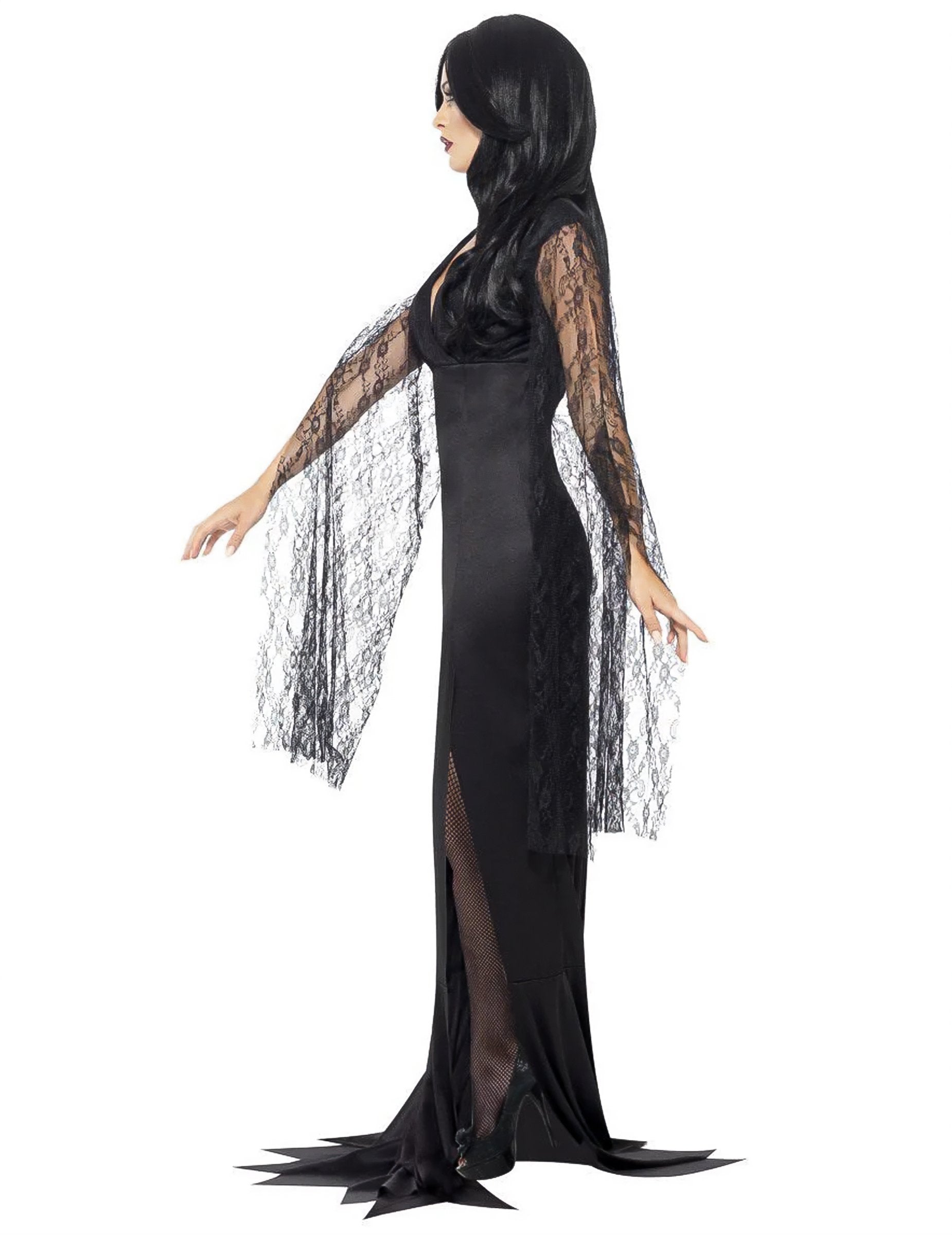 Ovaj kostim vještice za žene sastoji se od haljine (najlonke i cipele nisu uključene). Duga haljina je crna, s čipkastim rukavima. Na prsima je haljina prekrivena istom tom čipkom.