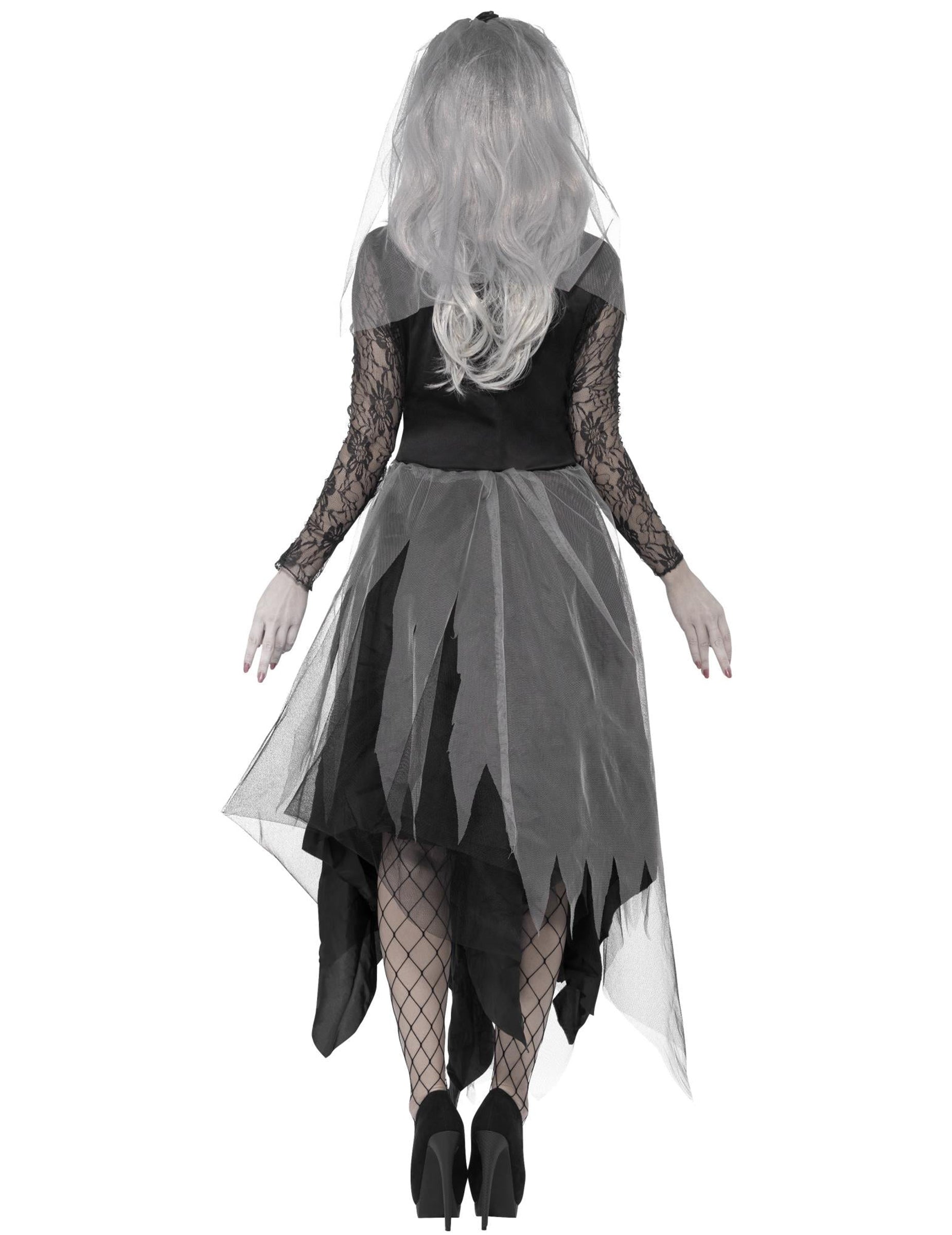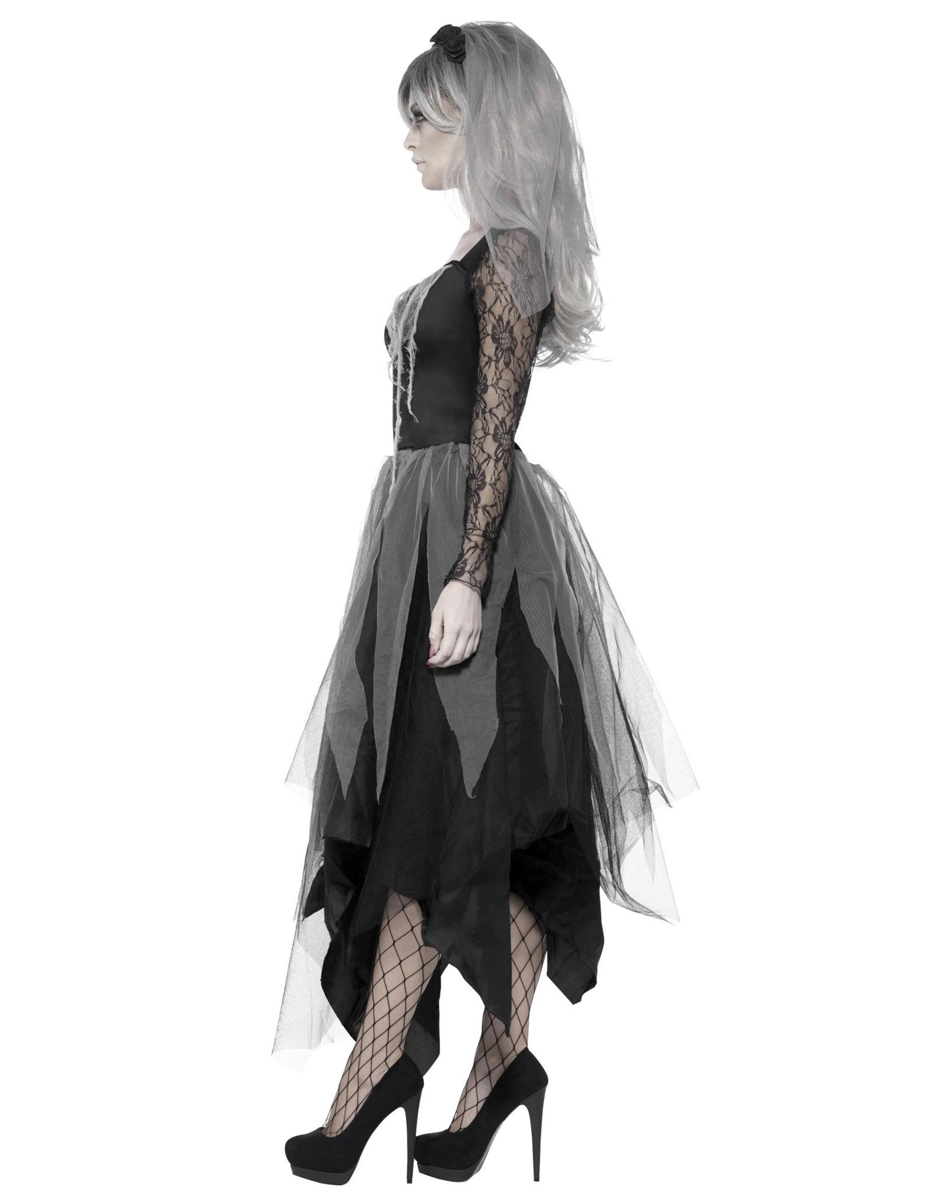 Ovaj kostim duha oženjen za žene sastoji se od haljine i trake za glavu. Haljina je crna s čipkastim rukavima. Dno haljine, izrezane na vrhove, previdaju crne i sive rufe. Ova se haljina lako stavlja bez zatvaranja. Crna traka za glavu ukrašena je lažnom satenom ružičastom u crnoj boji. Također ima kratki sivi veo koji će vam pasti na stražnjem dijelu glave. Ovaj kostim za mladenke duhova bit će savršen za paradu na ulicama u potrazi za vašim pokojnim mužem na večeri Noći vještica.