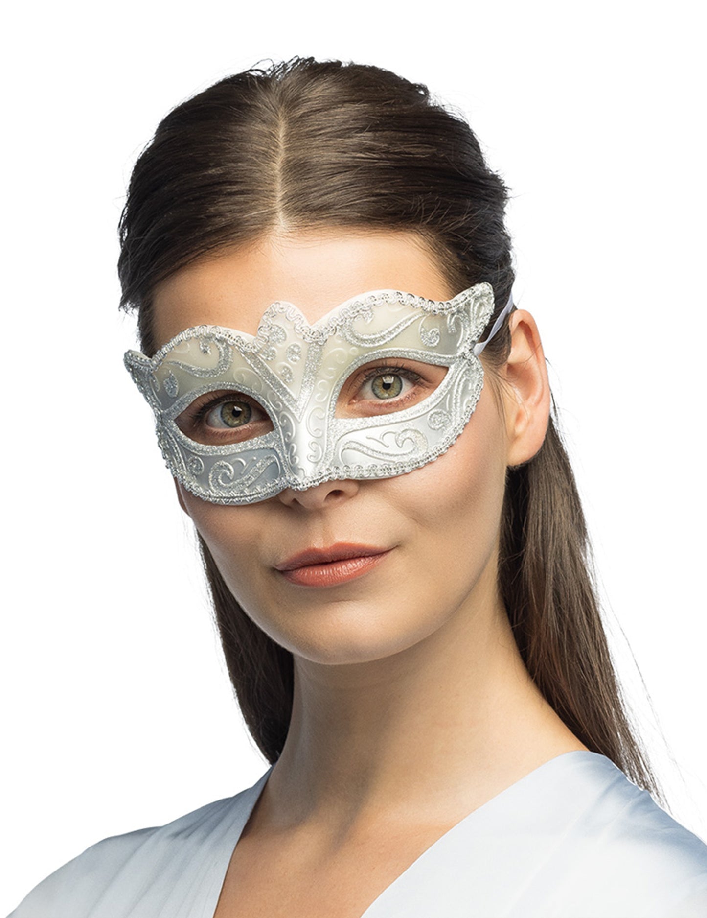 Ovaj venecijanski vuk za odrasle je srebrne boje. U plastici je ukrašen sjajnim arabeskama. Ovaj vuk će vam se lako vezati u glavi pomoću bijelih veza. Ovaj vuk bit će savršen za vaše maskirane i seksi večeri.