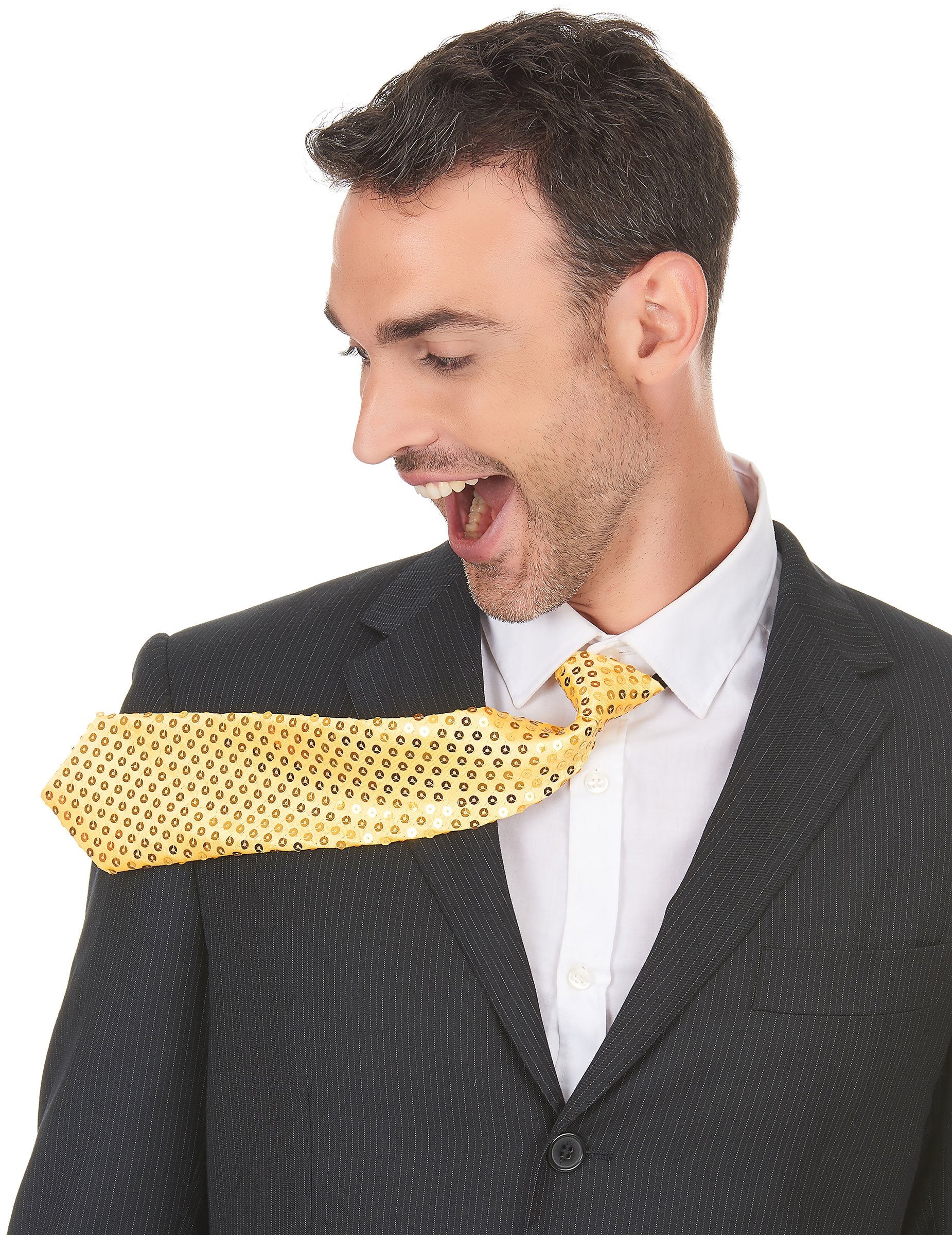 Ova odrasla kravata izrađena je od zlatne satenske tkanine. Prekriven je zlatnim šljokicama. Ova kravata je duljina otprilike 38 cm. To se oko vrata održava elastikom. Ova zlatna kravata bit će savršena za dovršavanje odjeće s Chic -om.