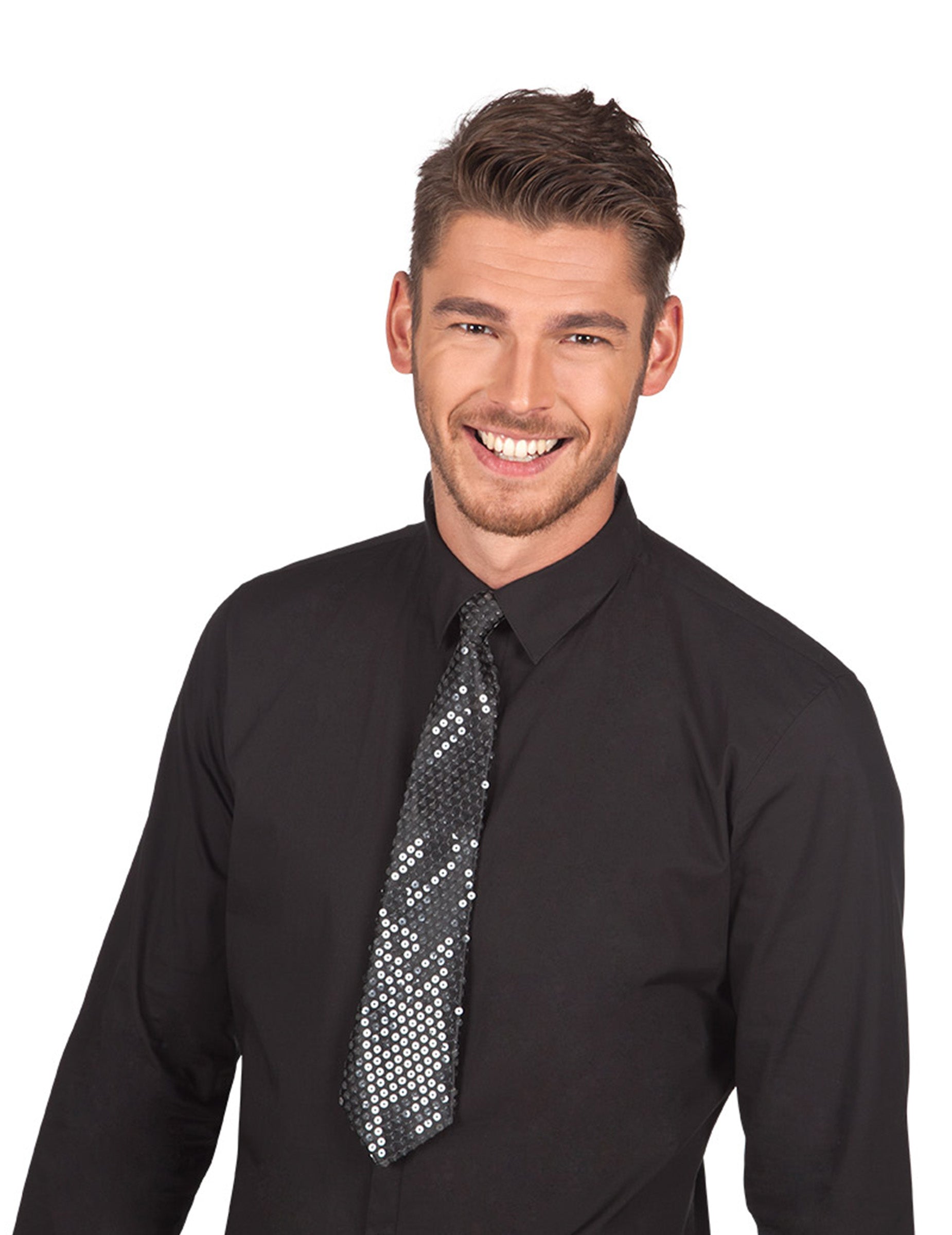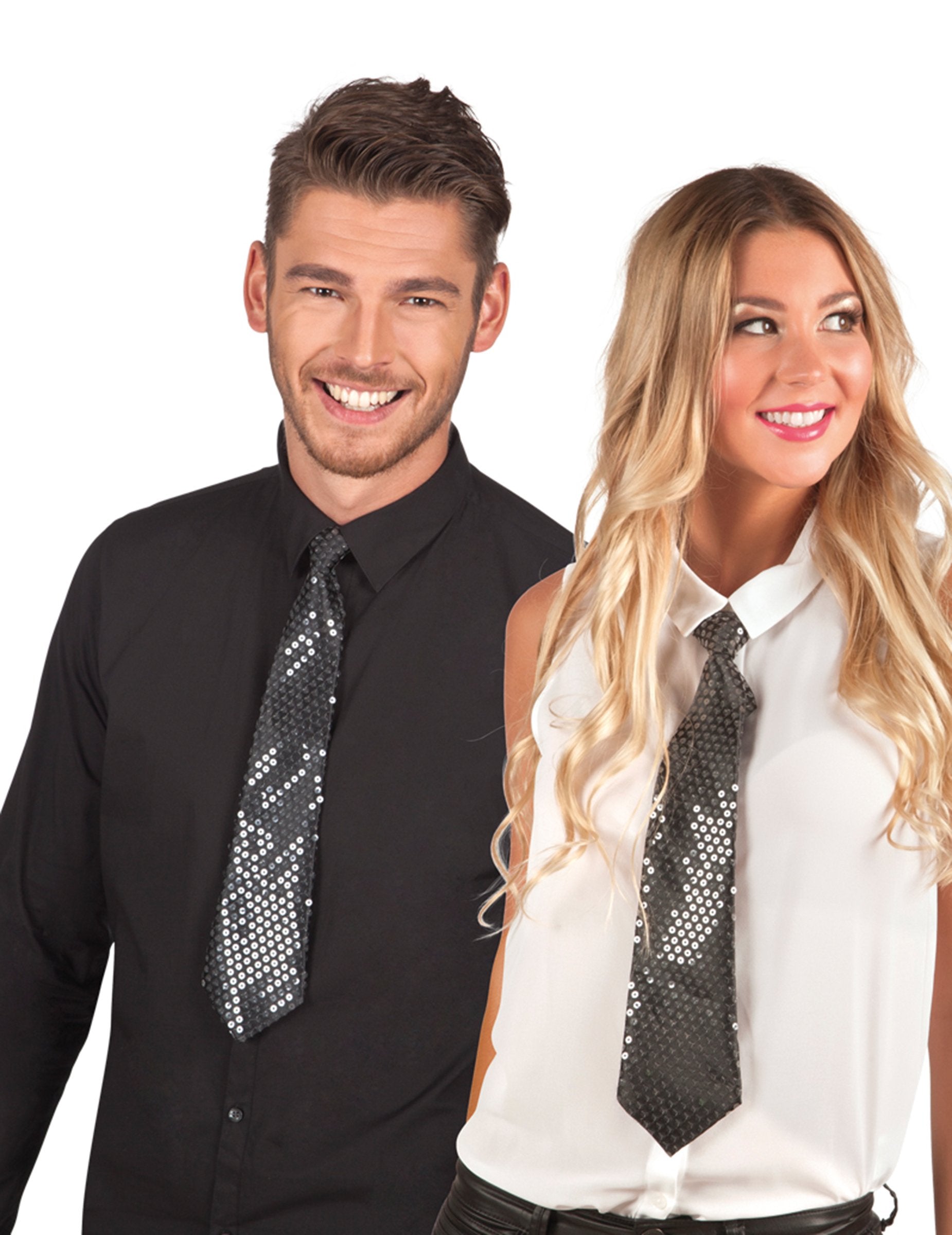 Ova odrasla kravata izrađena je od poliestera. Mjeri 39 cm od čvora do vrha. Crna tkanina prekrivena je prozirnim šljokicama ušivenim sjajnim efektom. Ova kravata nosi se na vratu zahvaljujući crnoj elastici. Unesite svoj disko ili klasični kostim s ovom pjenušavom kravate tijekom prikrivene večeri.