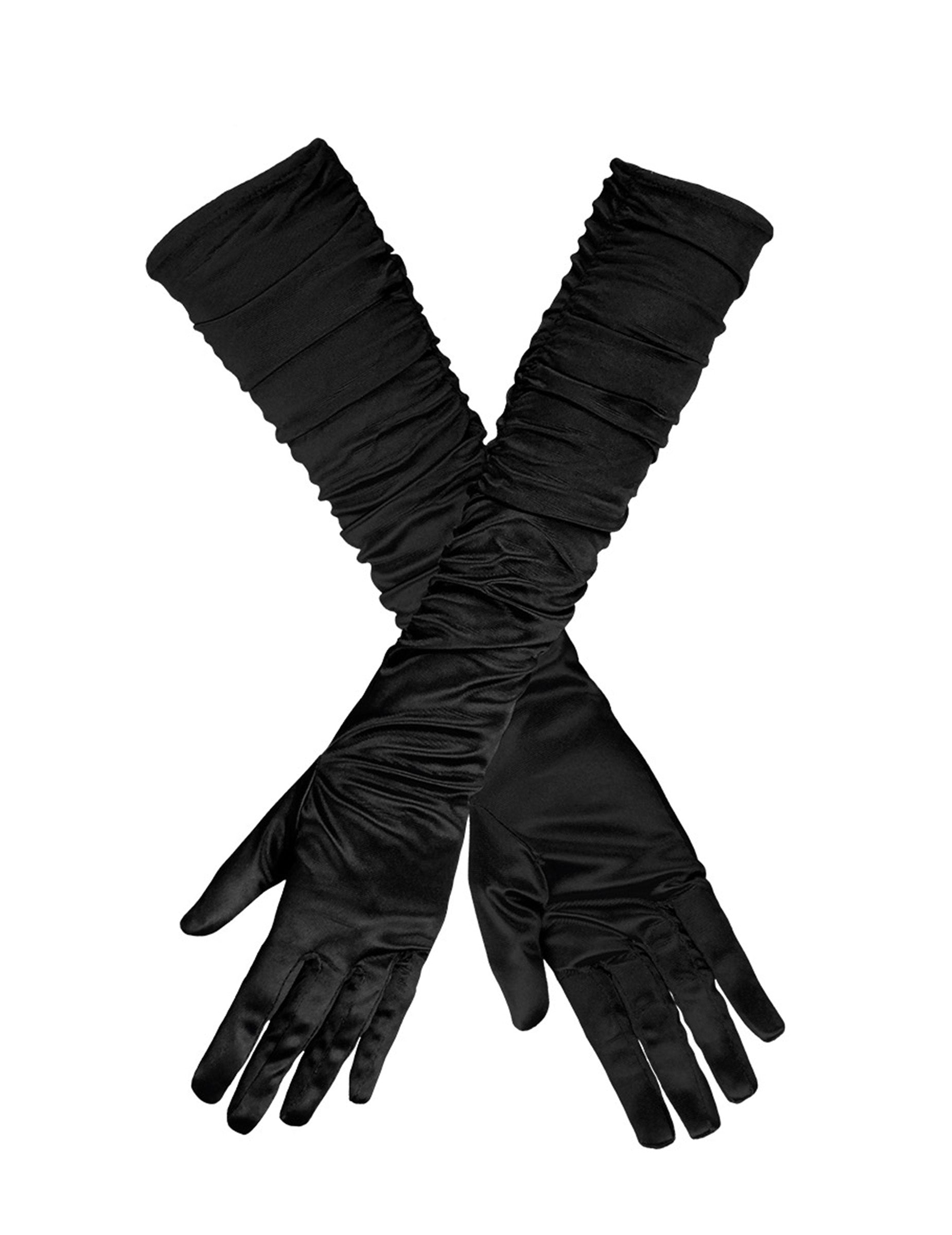 Ove duge satenske rukavice za odrasle su crne. Naplaćeni na stranama, duljine su oko 50 cm. Ove duge crne rukavice bit će savršene za dovršavanje glamurozne odjeće s klasom tijekom večeri kabareta.