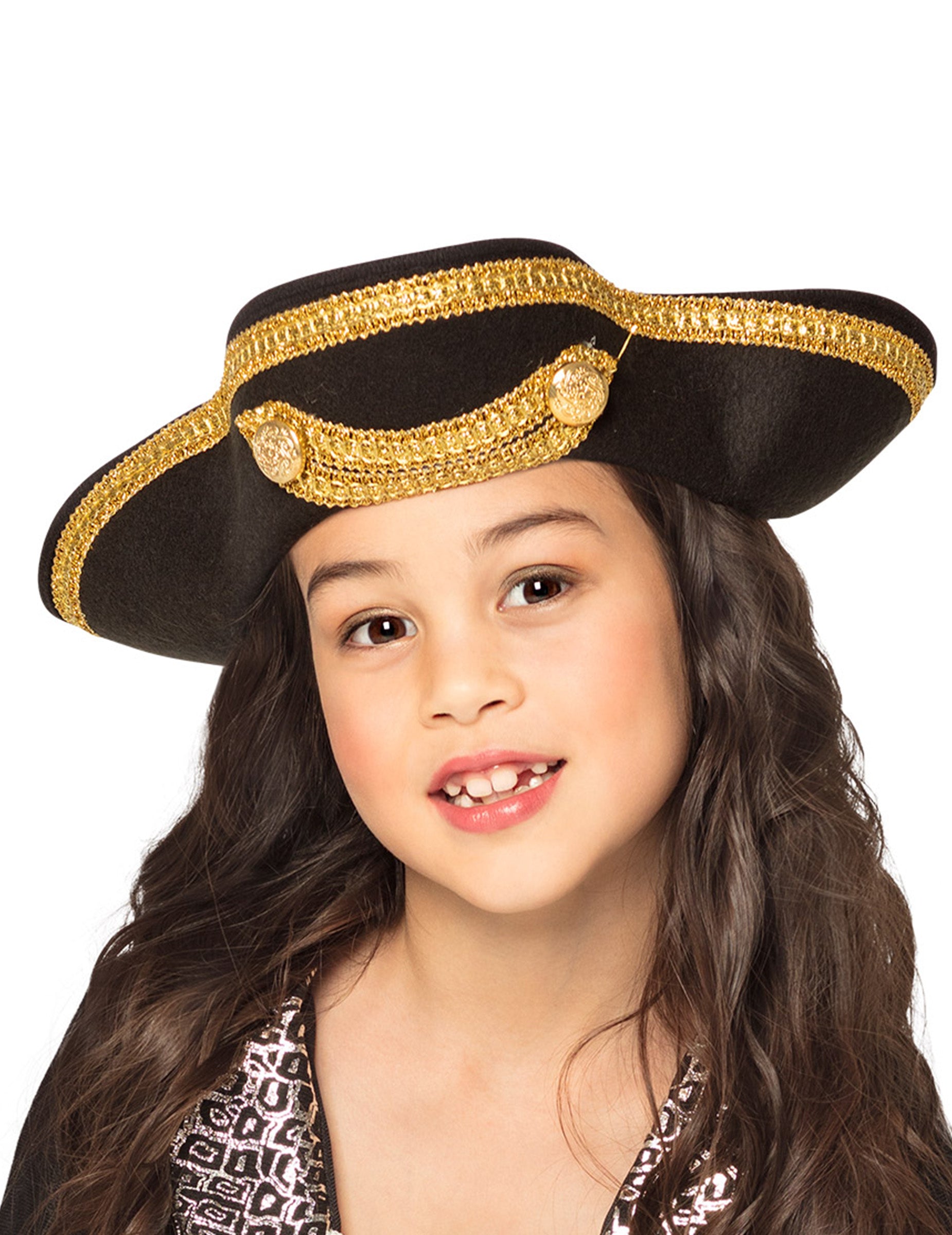 Ovaj dječji šešir je tricorne gusara. U crnoj poliesteru ima efekt osjećaja. Zlatna vrpca šiva se po cijelom opsegu šešira. Ogrebotine drže rubove podignute. Zlatni nabori s dva velika plastična gumba omogućuju razlikovanje kapetana od ostalih filibustera. Ovaj šešir ima krug glave od oko 54 cm. Ova tricorne bit će savršena za dovršavanje kostima u Corsairu koji će vaše dijete nositi za vrijeme karnevala ili prerušenu užinu.