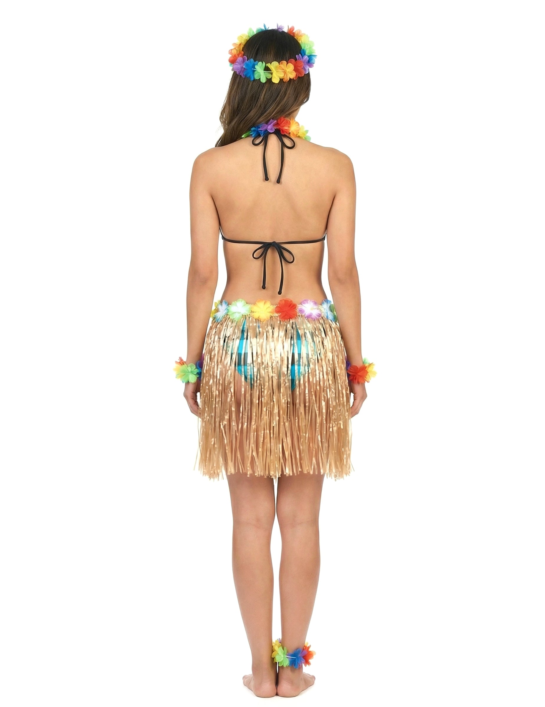 Ovo prerušavanje sastoji se od plastične suknje za žene. Ova obrubljena suknja je elastična u struku. Višebojni havajski cvjetovi također su ušiveni u veličini. Rubovi bež tonova daju efekt raffije ovoj suknji duljine otprilike 45 cm. Za večer na temu Havaja ili na plaži nosite ovu suknju s vrhom bikinija Vahiné!
