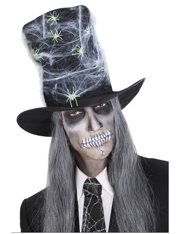 Ovaj šešir za odrasle je gornji crni oblik prekriven lažnim platnama i fosforescentnim paucima. Šešir je napravljen od filca. Toranj glave mjeri otprilike 60 cm. Pored vampirskog kostima, na primjer, ovaj će šešir dodati šik stranu u vaš kostim tijekom večeri prerušen u Noć vještica. Autorska prava Widmann SRL