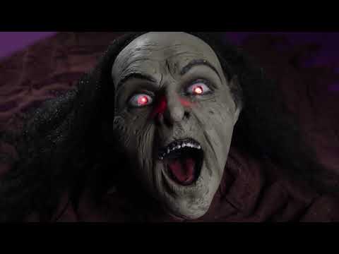 Ovaj ukras za Noć vještica predstavlja zastrašujuću vješticu. Dekoracija se sastoji od zastrašujuće glave zelene vještice i ruku iste boje. U visini je oko 50 cm duljine 90 cm iz ruku. Fluidna i složena smeđa tkanina pokriva rukave i leđa. Vještica ima crnu kosu i otvara joj usta kao da bi sranjela. Nakon što ga uključite zahvaljujući gumbu "uključivanje/isključivanje" iza vrata (uključene baterije), čut ćete krik terora i njezine crvene oči bljesne! Hort svi prolaznici -uz ovaj zastrašujući ukras na večeri Noći vještica. Autorska prava Widmann SRL