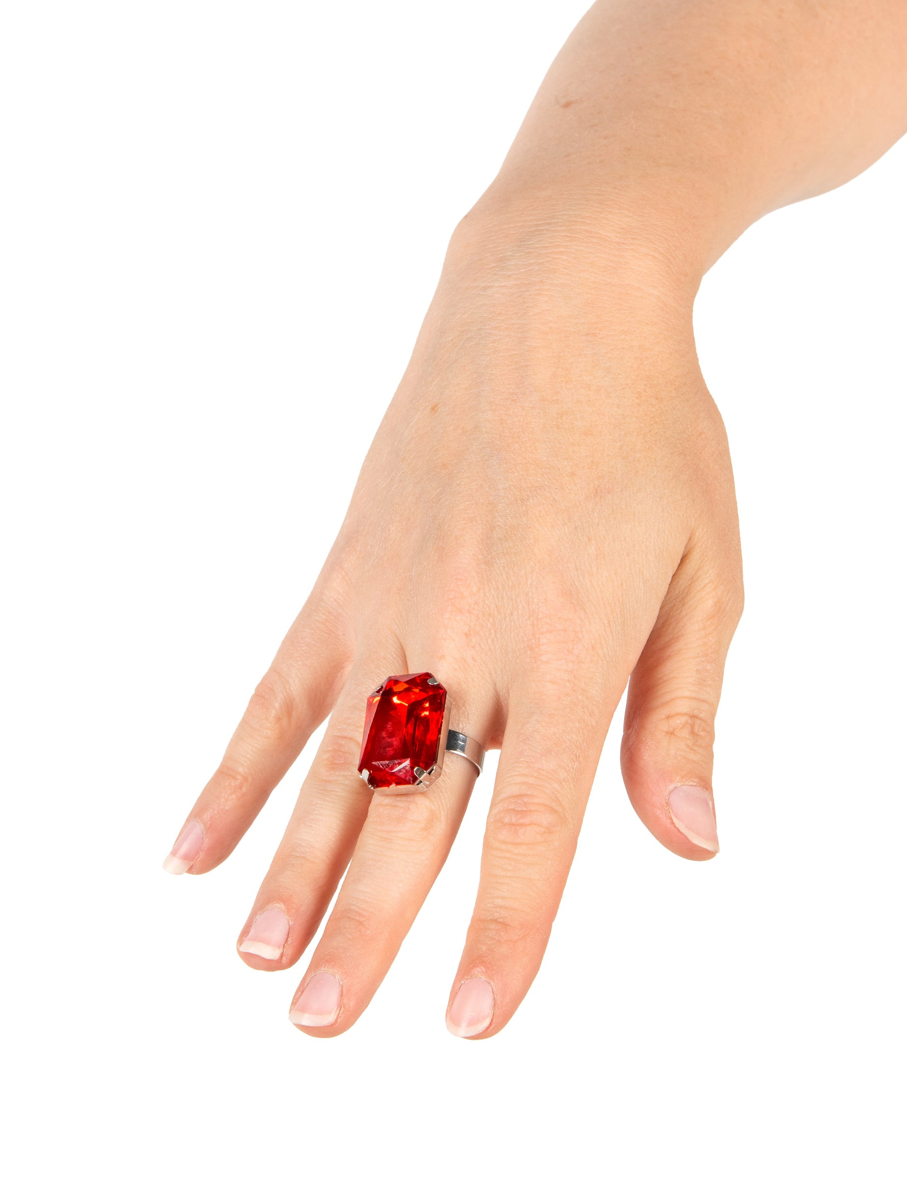 Ovaj dodatak za žene sastoji se od prstena. Nije prikladno za djecu mlađu od 14 godina. Podrška prstena kao i toranj prsta je srebrna. Veliki crveni plastični kamen lijepo je pjenušan. Ovaj prsten možete prilagoditi veličini prsta zahvaljujući malom otvoru koji se zateže ili odstupa kako želite. Jednostavno pristupite svim svojim odijelima za Noć vještica s ovim vrhunskim crvenim prstenom. Autorska prava Widmann SRL