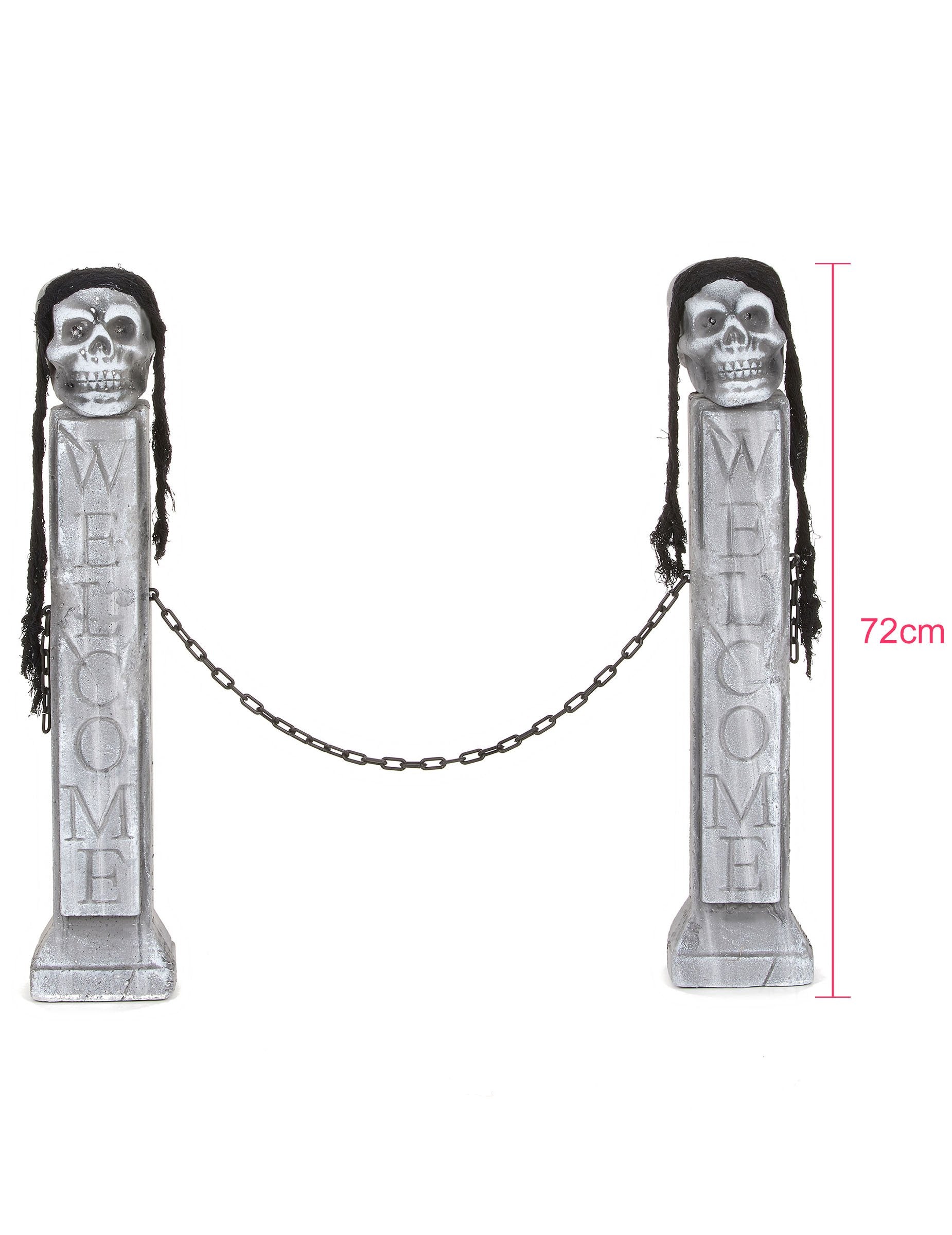 Ovaj ukras groblja Halloween sastoji se od 2 stupa polistirena. Kameni učinak, ovi stupovi mjere otprilike 75 x 15 x 10 cm. Spomenuti "Dobrodošli" ugraviran je na svaki od njih. Na vrhu stupova prisutna je lubanja koja je nadvladala crnu mrežu. Gumb "ON/OFF" prisutan je na stražnjoj strani ovih lubanja (uključene baterije). Aktiviranjem gumba, oči lubanje će se upaliti i bljeskati sve boje. Ovi stupovi efekta kamena pričvršćeni su jedni na druge crnim plastičnim lancem. Ovaj dodatak bit će bijes s prijateljima i bit će savršen za dovršavanje vašeg interijera ili vanjskog ukrasa na večeri Noć vještica.
