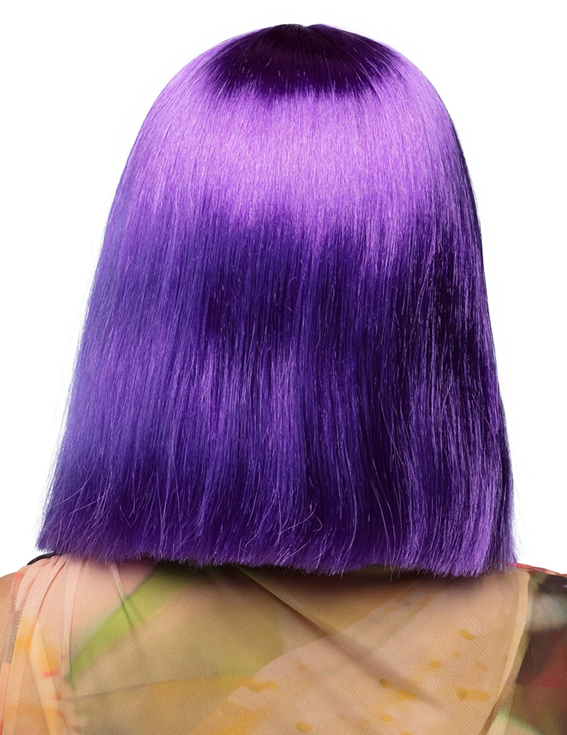 Ova ženska perika je u sintetičkoj kosi. Iz prekrasnog ljubičastog briljantnog ova lažna kosa iznosi oko 30 cm. Promijenite frizuru i nosite srednji trg s ravnim šiškama. Za prerušenu večernju diskoteku stavite ovu periku pored kostima ili seksi haljinu za glamurozni i šareni učinak.