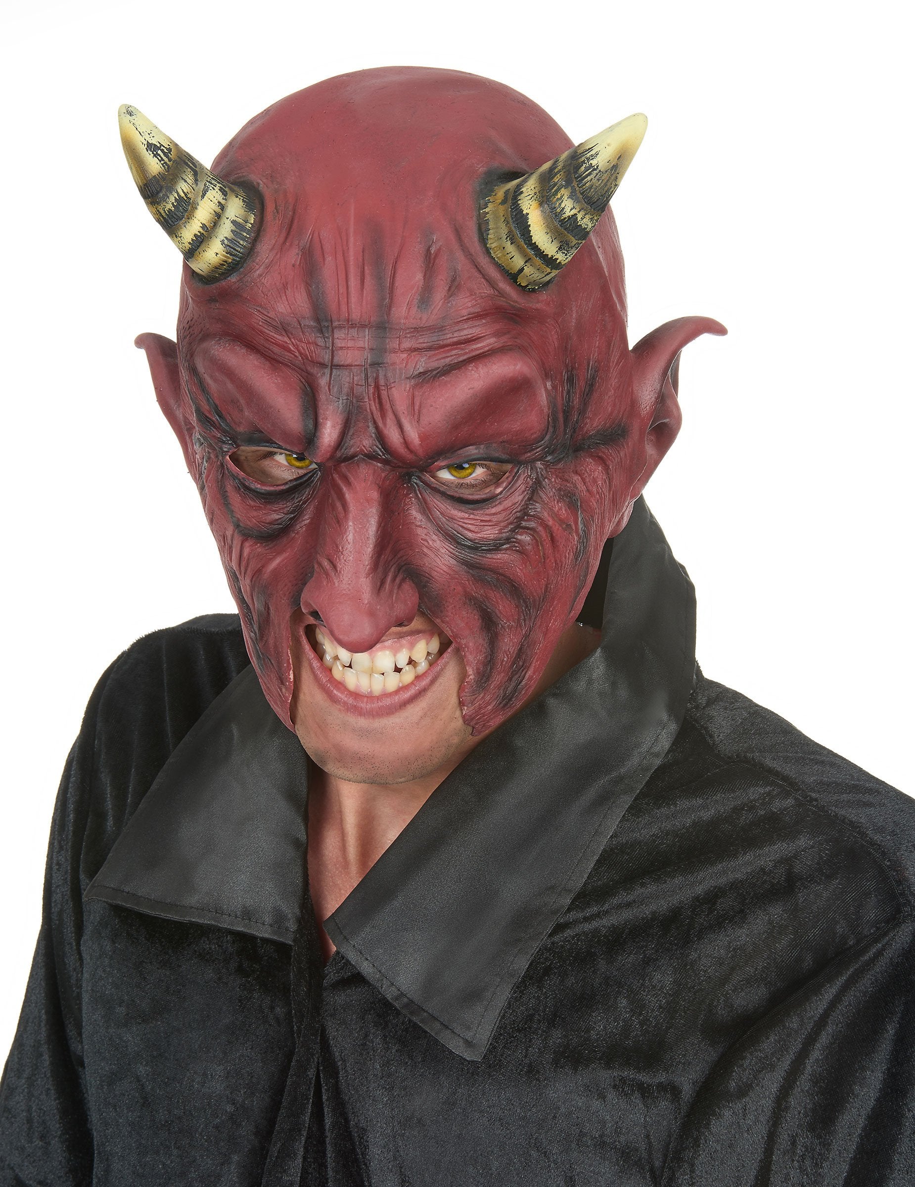 Ovaj polu-moza crvenog demona za odrasle je u lateksu. Ima dva roga visoka oko 10 cm i prisutna je elastika koja će olakšati njegovo održavanje. Ovaj dodatak idealan je za poboljšanje vašeg kostima na večeri Noći vještica ili za svečanu prigodu.