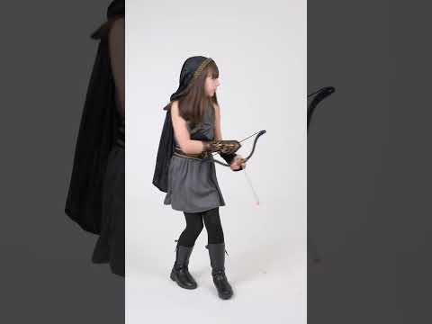 Ovaj lovac prerušen za djevojku sastoji se od ogrtača, kratke tunike, pojasa i 2 manžete. Crna kapuljača u boji je u baršunastom efektu. Zatvaranje lanca omogućit će da vam se pričvrsti oko vrata. Tunika haljina bez rukava siva je u boji s vezanje dekoltea. Lažna kožna traka sa zlatnom petljom dovršava ovu tuniku. Crni i zlatni pojas ukrašen je fantastičnim uzorkom. Bit će vezan oko vašeg struka. 2 manšete su u smislu baršunastog učinka. Ovaj kostim Hunter bit će savršen za srednjovjekovnu odjeću ili fantastičnu tematsku zabavu.