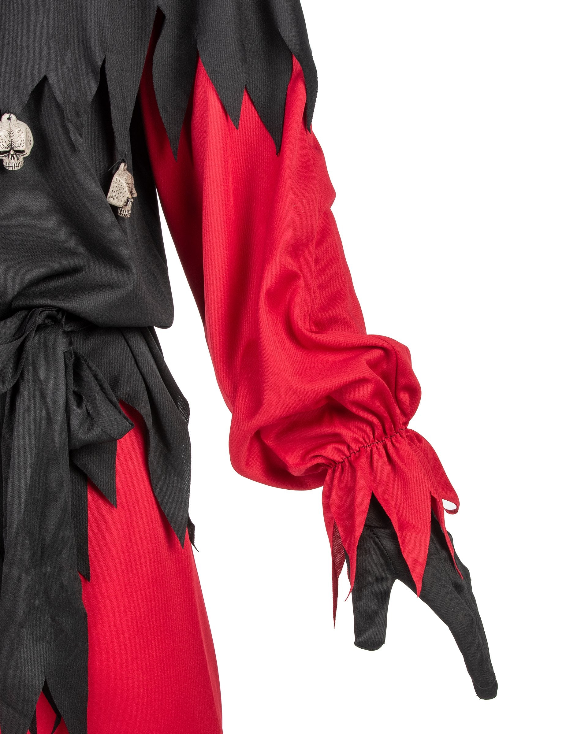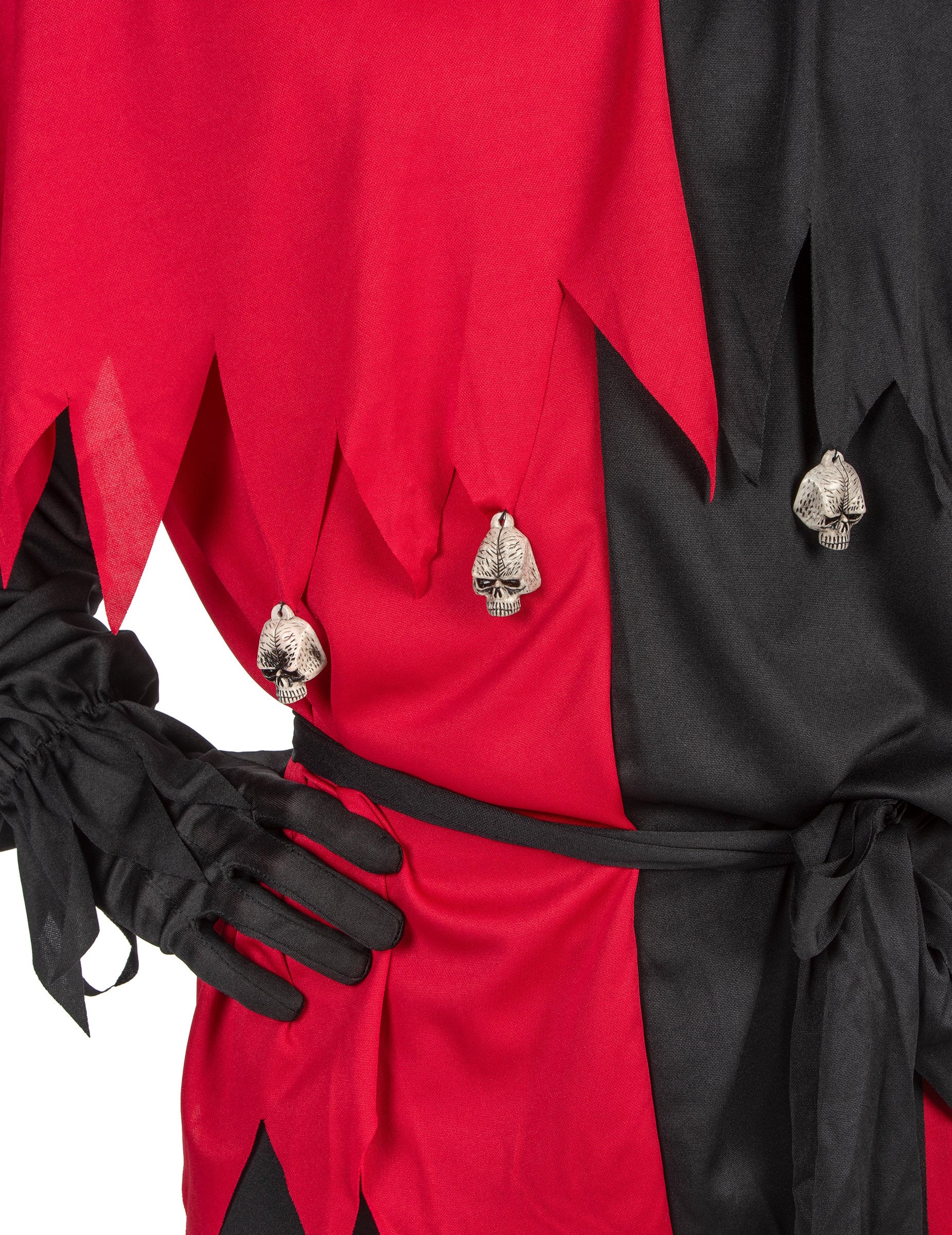 Ovaj ludi kostim Joker za muškarce sastoji se od vrha, hlača, haube, maske i pojasa. Dva kolorija visoka je crna i burgundska. Izrezan je na vrhove na dnu i rukave. Crni pojas će se vezati oko struka. Hlače za podudaranje elastične su u struku za više utjehe. Hood, također dva tona, ima dvije podstavljene točke na vrhu glave. Ima minijaturni ogrtač na kojem su obješene male lubanje. Otvaranje je prisutno na glavi. Ova kapuljača dovršava se pola meke plastične maske. Predstavlja demonski kostur sastavljen u džokeru. Elastika će vam omogućiti da je lako držite do lica. Ovaj puni ludi kostim Joker bit će savršen za promjenu vas tijekom Noći vještica.