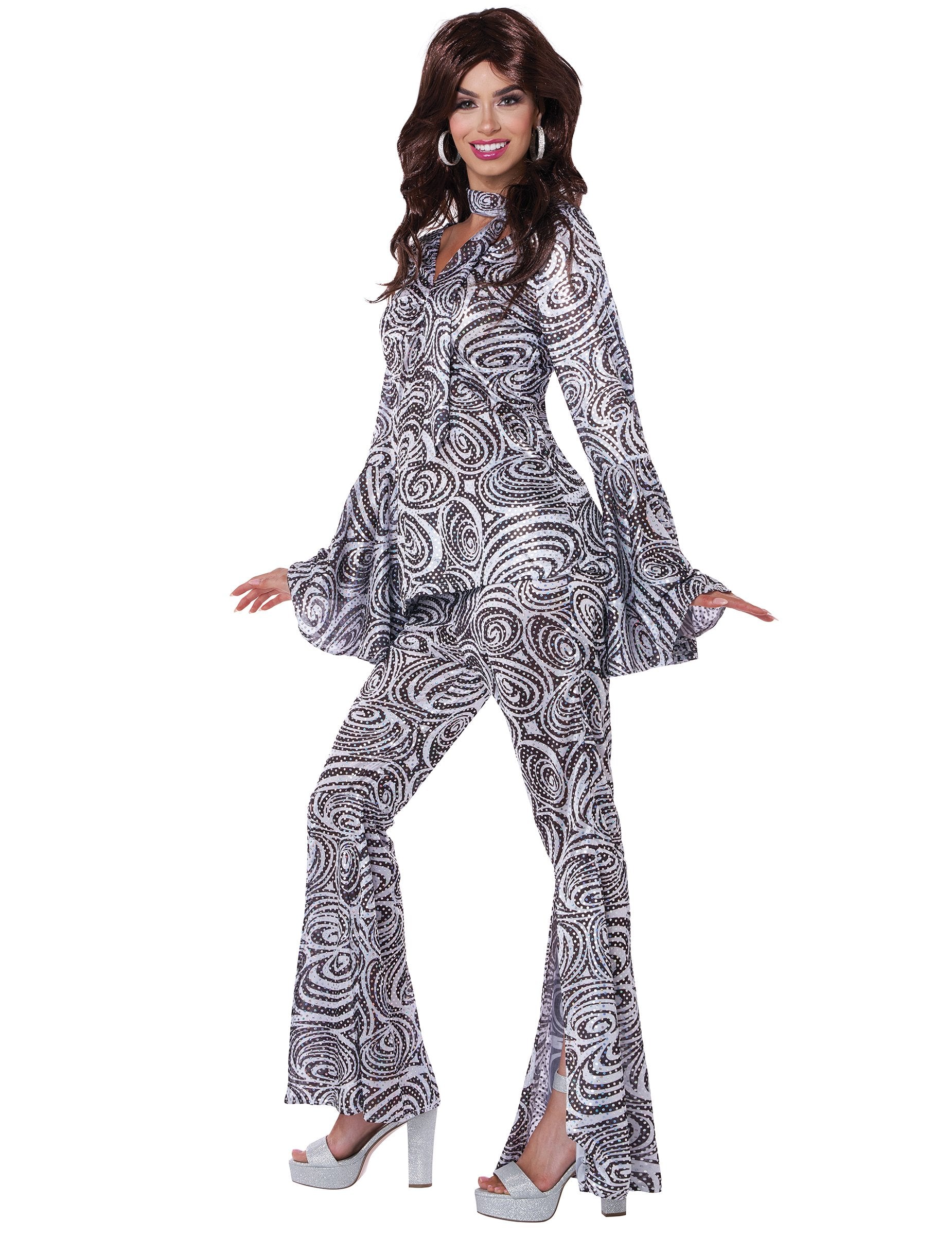 Ovaj disko prerušen za žene sastoji se od vrha, hlača i traka za kosu (nisu uključene cipele). Vrh je bijeli, a nula crnih uzoraka ispisuju se na cijelom odjevnom predmetu. Sequins Pearls dolaze da sjajan učinak unese u odjeću. Rukavi su dugi i plamteni u laktovima. Hlače za podudaranje elastične su u struku za više utjehe. Na nogama se plamti i podijeli se s koljena zbog natečenog učinka. Konačno, traka za glavu koju možete lako udarati oko glave dolazi do posljednjeg dodira u odjeću. Ovaj sjajni kostim bit će savršen za pretvaranje u pravu kraljicu plesnog dizala tijekom večeri na temi Disco.