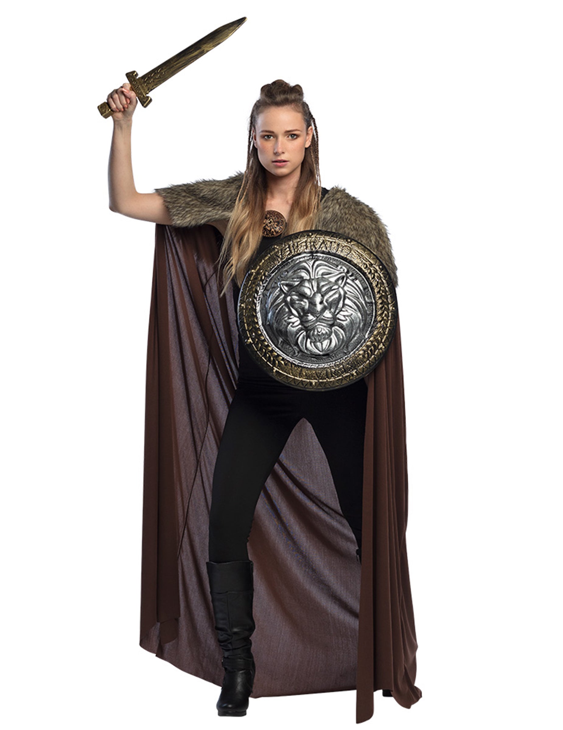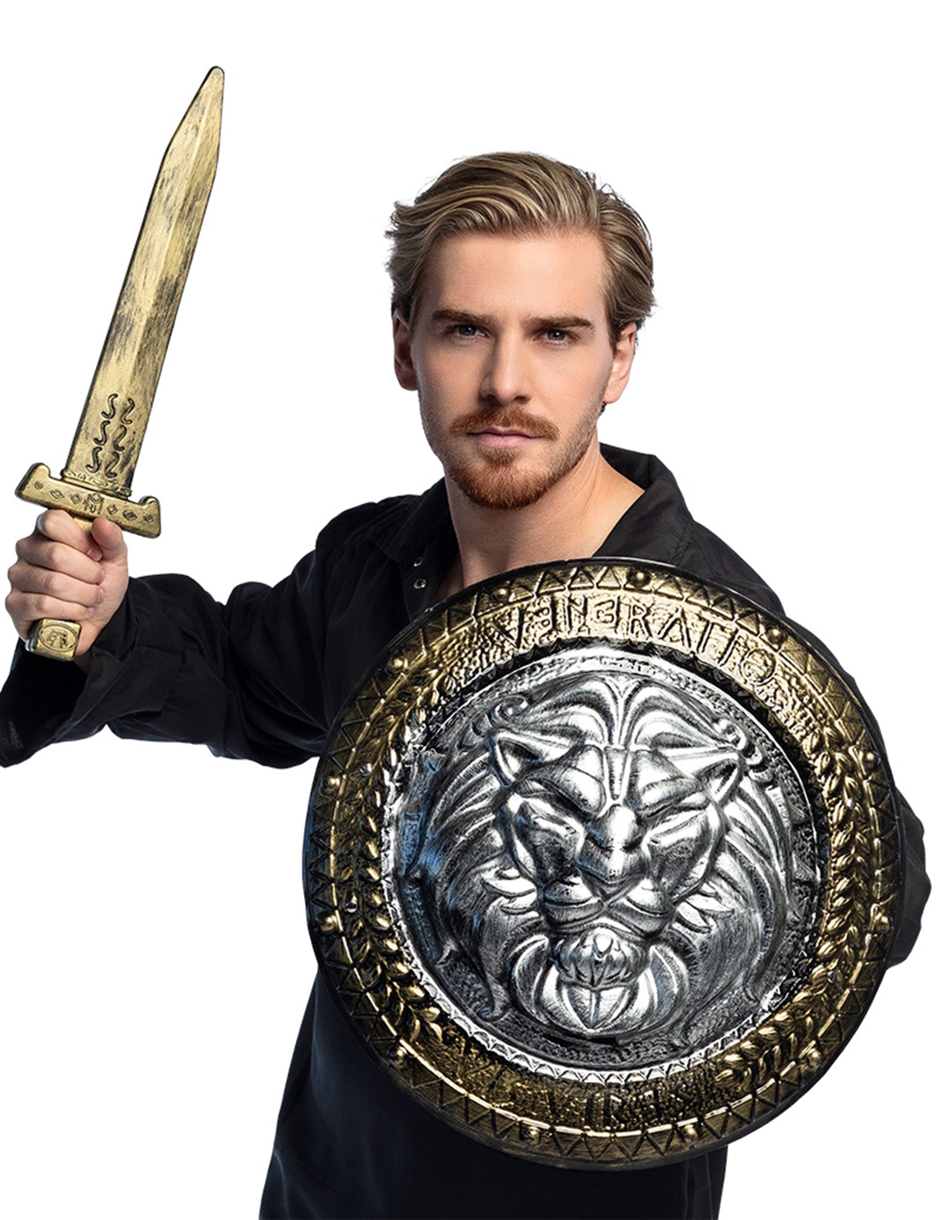 Ovaj set pribora sastoji se od štita i gladijatorskog mača. Plastični štit je zlatne boje. Mjeri promjera otprilike 46 cm i ukrašen je lavovom glavom i rimskim uzorcima. Mač podudaranja mjeri otprilike 61 cm. Oštrica je srebrna, a smeđa ručka. Dovršite svoj gladijatorski kostim tijekom sljedećih prikrivenih večeri.