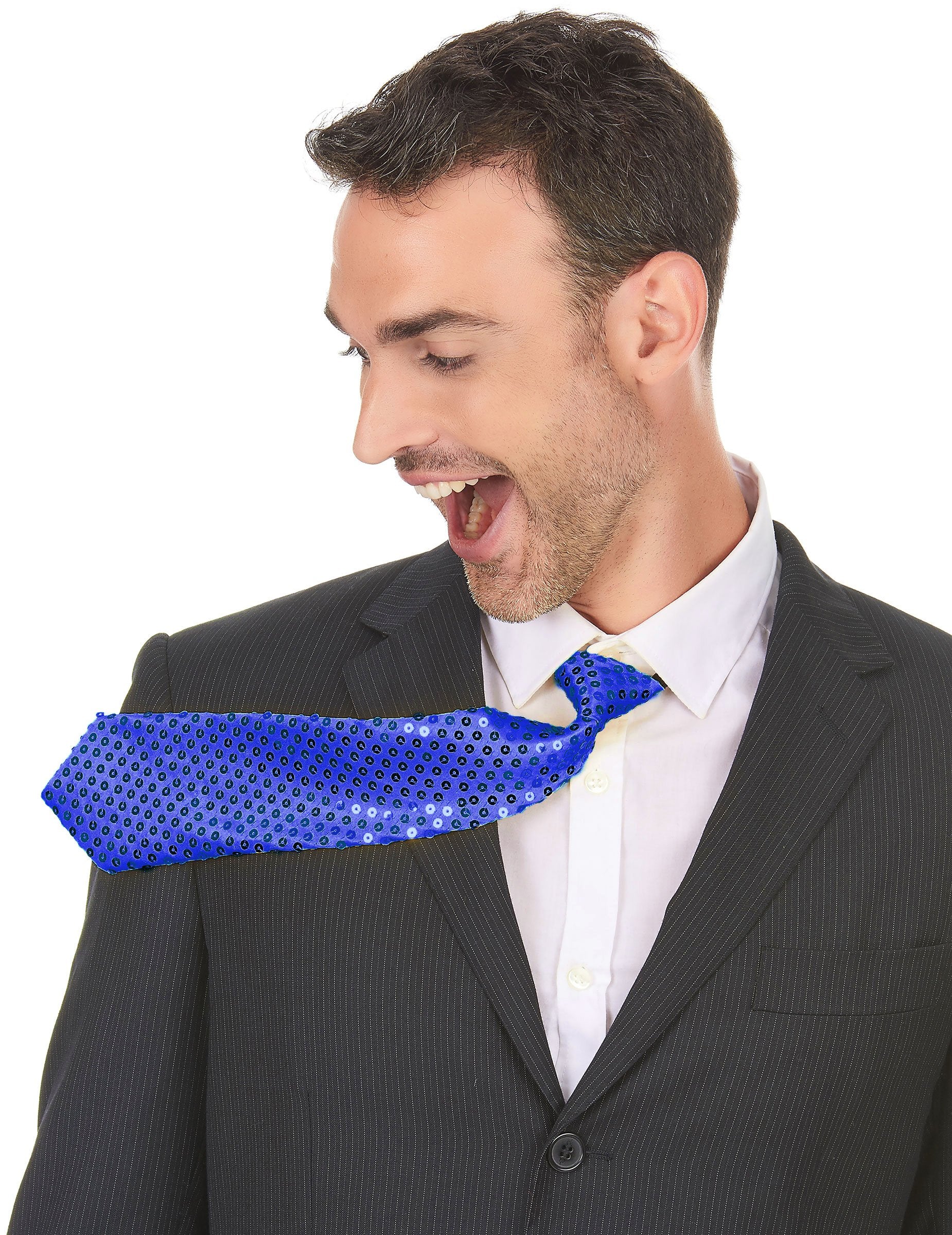 Ova blistava kravata za odrasle je plava. Prekriven je sjajnim šljokicama i mjera duljine oko 36 cm. Održava se oko vrata zahvaljujući crnoj elastici. Vrlo sjajno, bit će savršeno za dovršavanje kostima tijekom karnevala ili za bilo koji drugi prikriveni događaj.