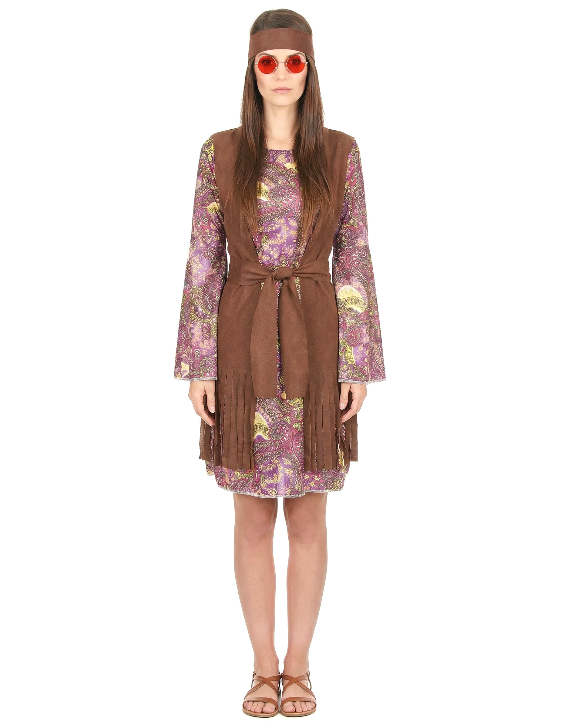 Haljina je srednje dužine i ima duge, zvonaste rukave. Tisak je s "paisley" uzorkom s dominantnom ružičastom bojom. Na prednjoj strani haljine je direktno prišiven smeđi prsluk s resama od filca.