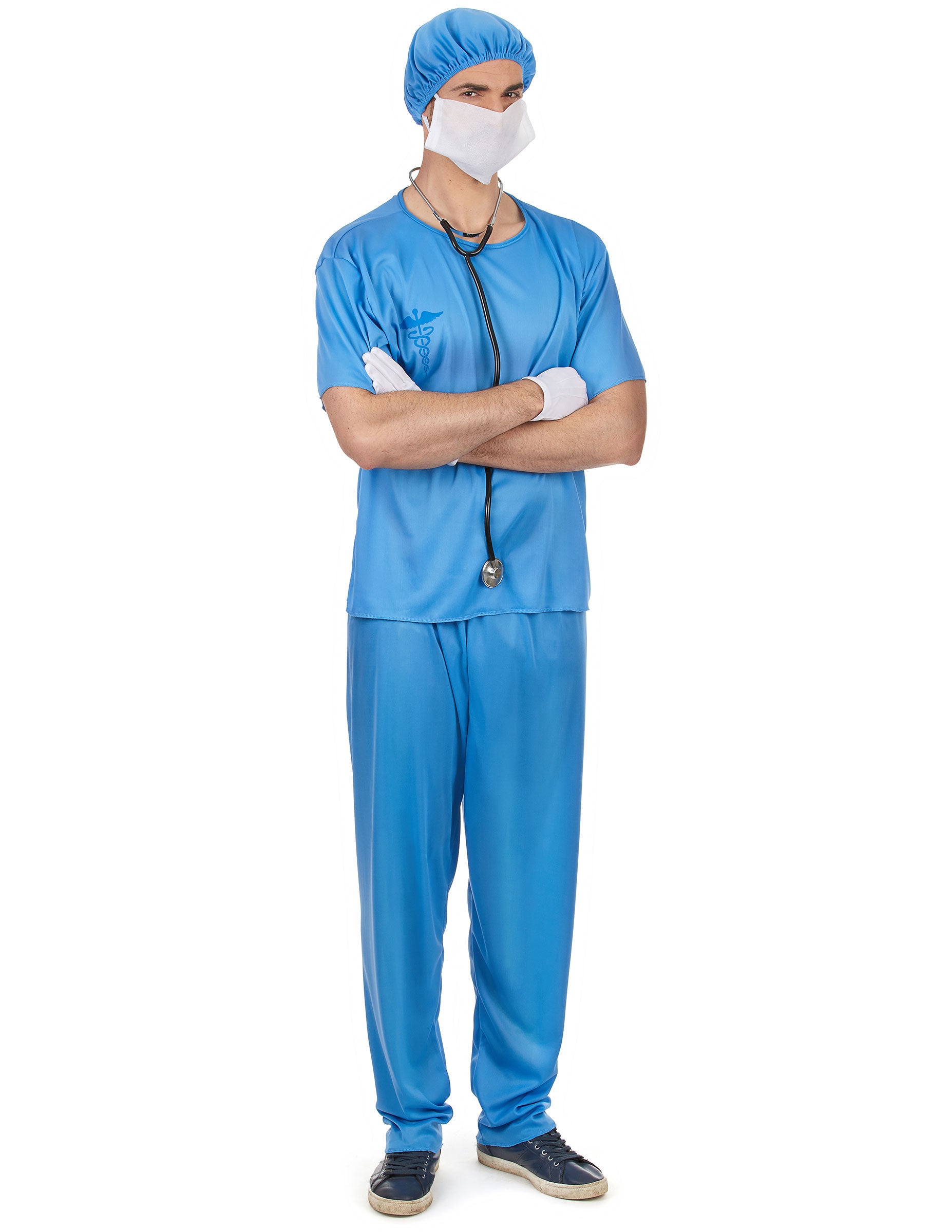 Kostim ovog kirurga namijenjen je za muškarce i sastoji se od vrha, hlača, Charlotte i maske (cipele, stetoskop i rukavice nisu uključeni). Vrh i hlače su jasne plave. Na prsima je prisutan simbol kaduceusa. Malo je tamnije plavo. Hlače su na elastičnoj veličini, a vrh se jednostavno stavlja poput majice. Charlotte će vam biti smještena na glavu zahvaljujući elastici. Njegova je plava kao i ostatak prerušavanja. Konačno, maska je izrađena od bijelog filca i držat će vam se u lice zahvaljujući elastičnim bendovima. Ova vrlo realna prerušavanja bit će savršena za igranje liječnika povodom prerušenog dana.