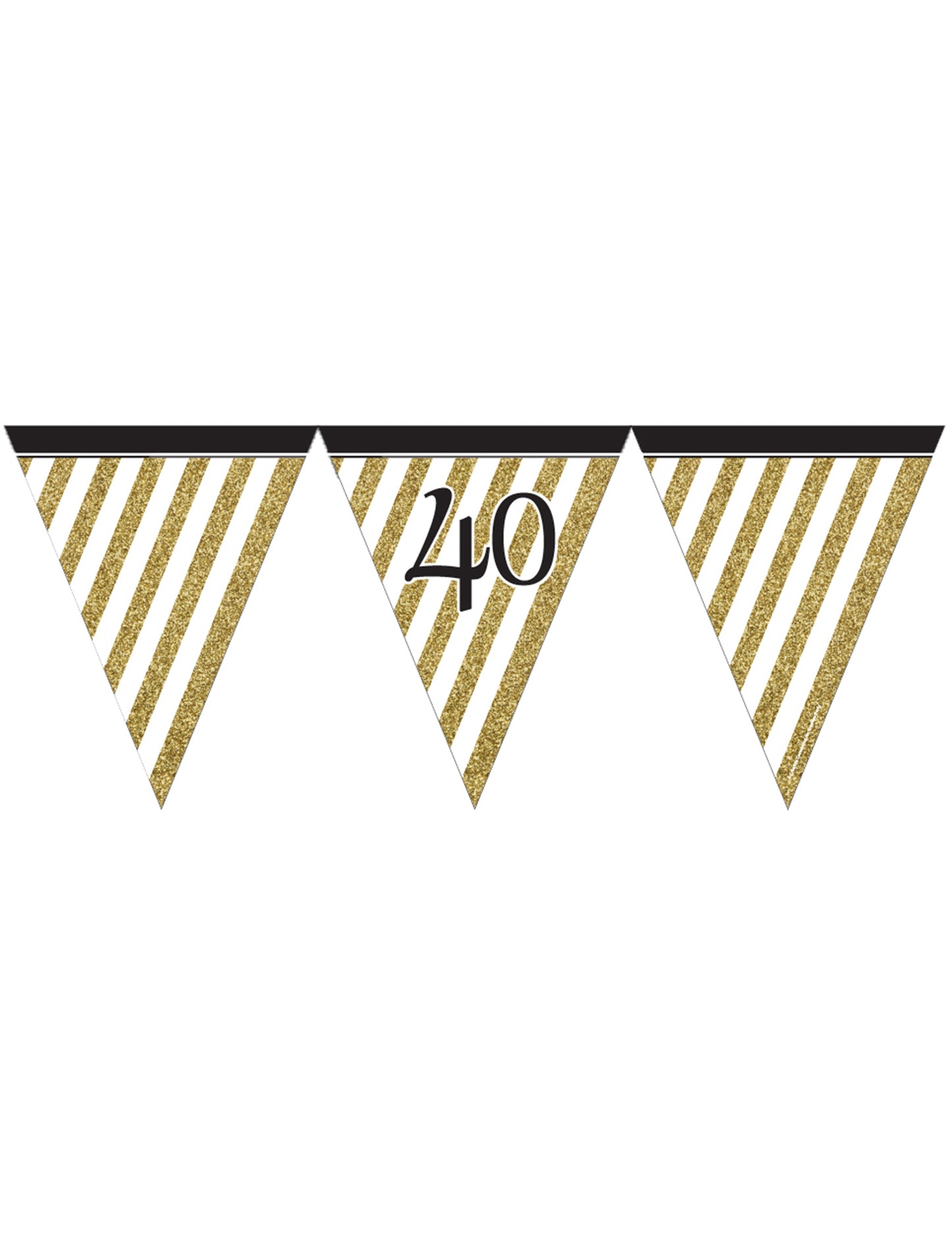 Ovaj vijenac za zastavicu ima duljinu od 3,7 metara. Uključuje 11 papirnatih zastavica veličine od 23 x 18 cm. Ove su zastarjele bijele boje sa zlatnim prugama. Lik "40" napisana je crnom bojom na jednoj od dvije zastavice. Ovaj vijenac za zastavicu bit će savršen za stvaranje elegantnog ukrasa za rođendan tijekom vašeg 40. rođendana!