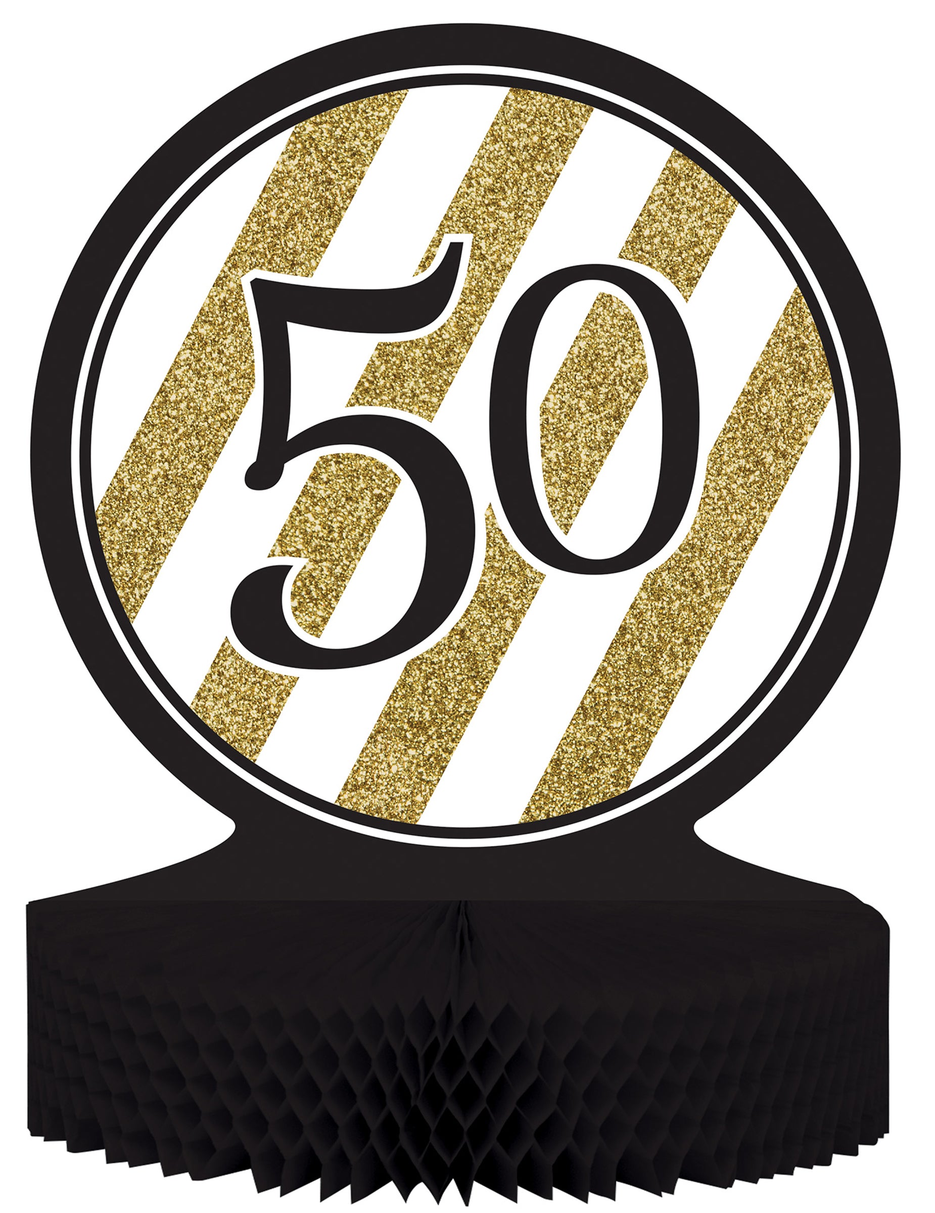 Ovaj 50 -godišnji stolni centar je kartonski papir. Crna je i mjeri oko 30 cm visine. Sastoji se od diska, kao i laganih lutki koje su spuštene na dnu. Disk ima otisak bijelih i zlatnih prugastih ogrebotina, kao i figuru "50" na prednjoj i stražnjoj strani. Ovaj lijepi ukras bit će savršen za vaš stol povodom vašeg 50. rođendana!
