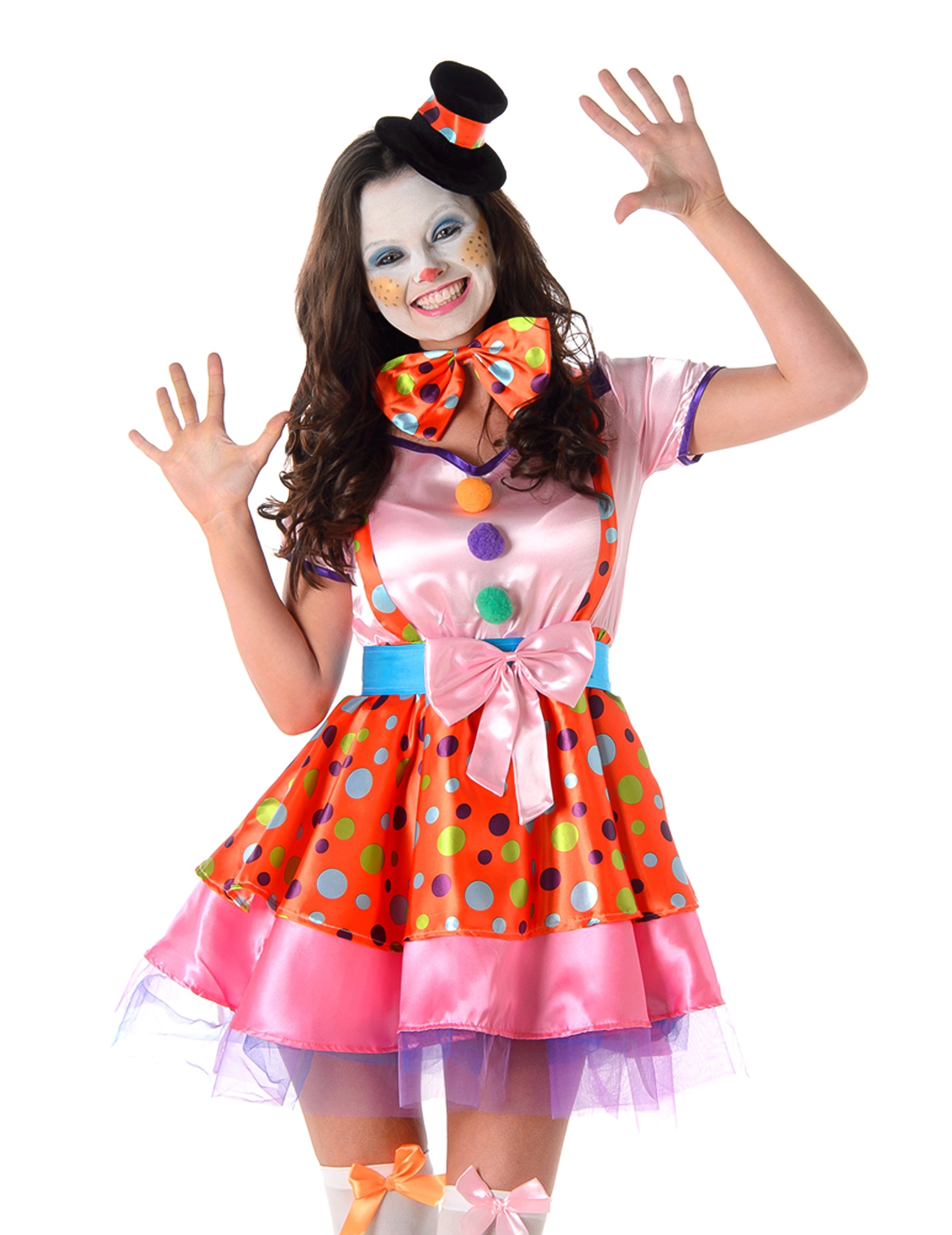 Ovaj kostim klauna sastoji se od haljine, čvora, šešira, pojasa i par čarapa (cipele nisu uključene). Potpuno šarena, kratka haljina ima svijetle boje: narančasta, ružičasta, ljubičasta, zelena, plava za ludi efekt! Poboljšana je ljubičastim tikvicama od tila koji nudi dodatni volumen i nudi odjeću za lutku za bebe! Zatvara se čistijim štitom na leđima. Gornji dio daje iluziju pregače s raznobojnim polka točkicama ispod ružičaste bluze ukrašene velikim šarenim graškom. Haljina je zakrivljena u struku zahvaljujući elastici, a uključeni pojas omogućuje naglašavanje veličine i ukrašava velikim satenskim ružičastim čvorom. Dovršite odjeću s par bijelih čarapa ukrašenih narančastim i ružičastim čvorovima koji se prisjećaju čvora koji će se zabiti oko vrata! Konačno, crni šešir s baršunastim dodirom fiksiran je u kosi s kliještima za optimalnu podršku! Smicule ne ubija! Budite smiješni i seksi prema svojim večerima prerušenim na temu cirkusa s ovim prerušenim klaunom!