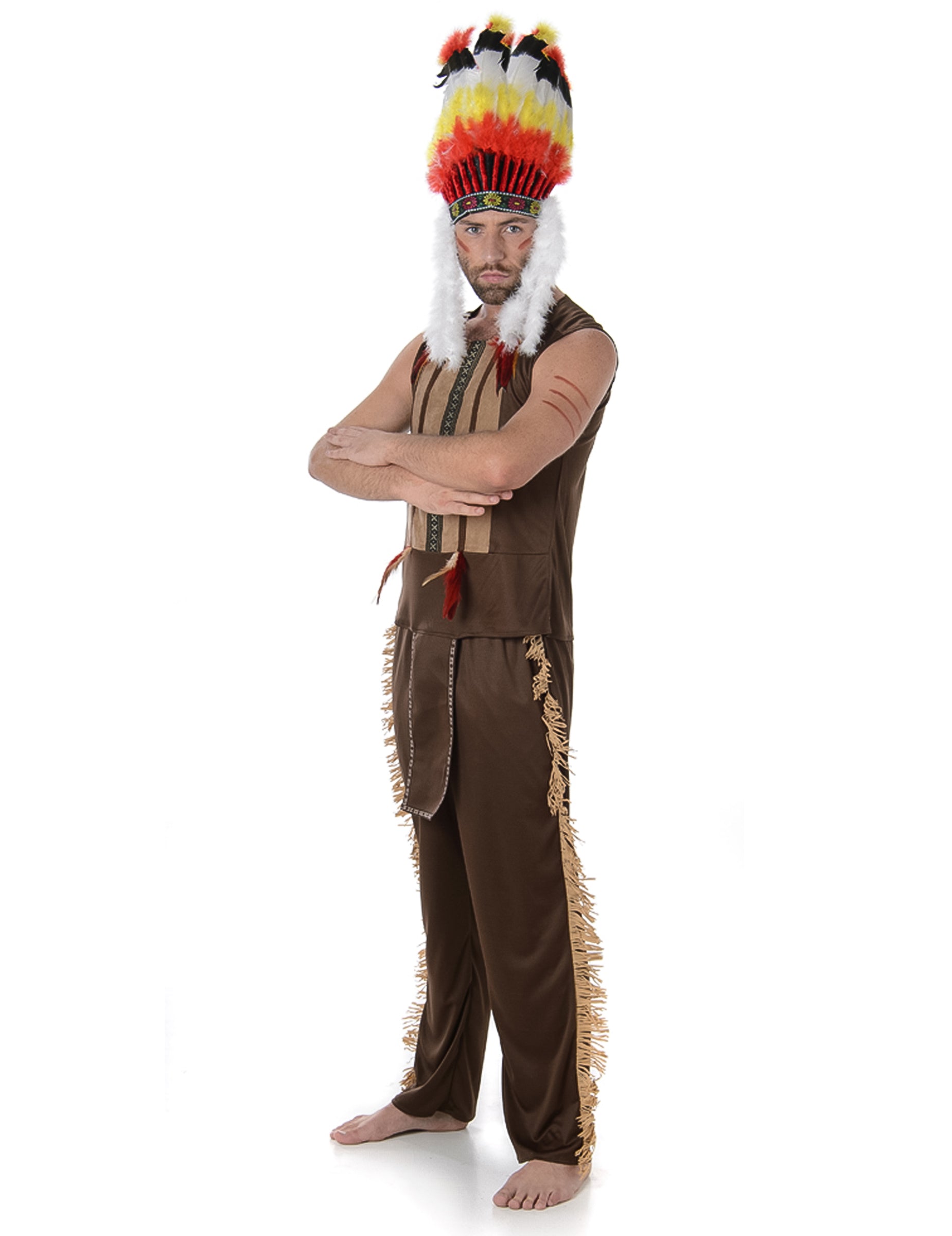 Kostim ovog indijskog poglavara za muškarce sastoji se od hlača, vrha i kapice. Vrh visokih uboda je tamno smeđi, s lakšom trakom efekta kože na prednjoj strani. Ukrašen je nekoliko perja na razini vrata. Smeđe hlače su elastične u struku. Ukrašen je malim rubovima na stranama. Konačno, naslovnica indijskog šefa dođe do završetka ove odjeće. Ova je poklopac ukrašena velikim šarenim perjem i elastična je straga kako biste se prilagodili okretaju glave. Oživite vrijeme Indijanaca tijekom karnevala ili drugog svečanog događaja.