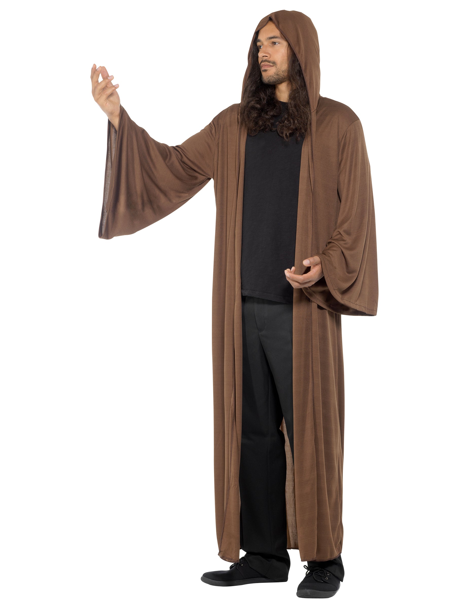 Ova kapuljača s kapuljačom s kapuljačom je smeđe boje. Ima duge rukave i kapuljaču, ali ne zatvara se. Mjeri približno 148 cm duljine (a da ne spominjemo haubu). Ovaj dodatak savršeno će dovršiti vaš monaški kostim za večer za Noć vještica ili za karneval.