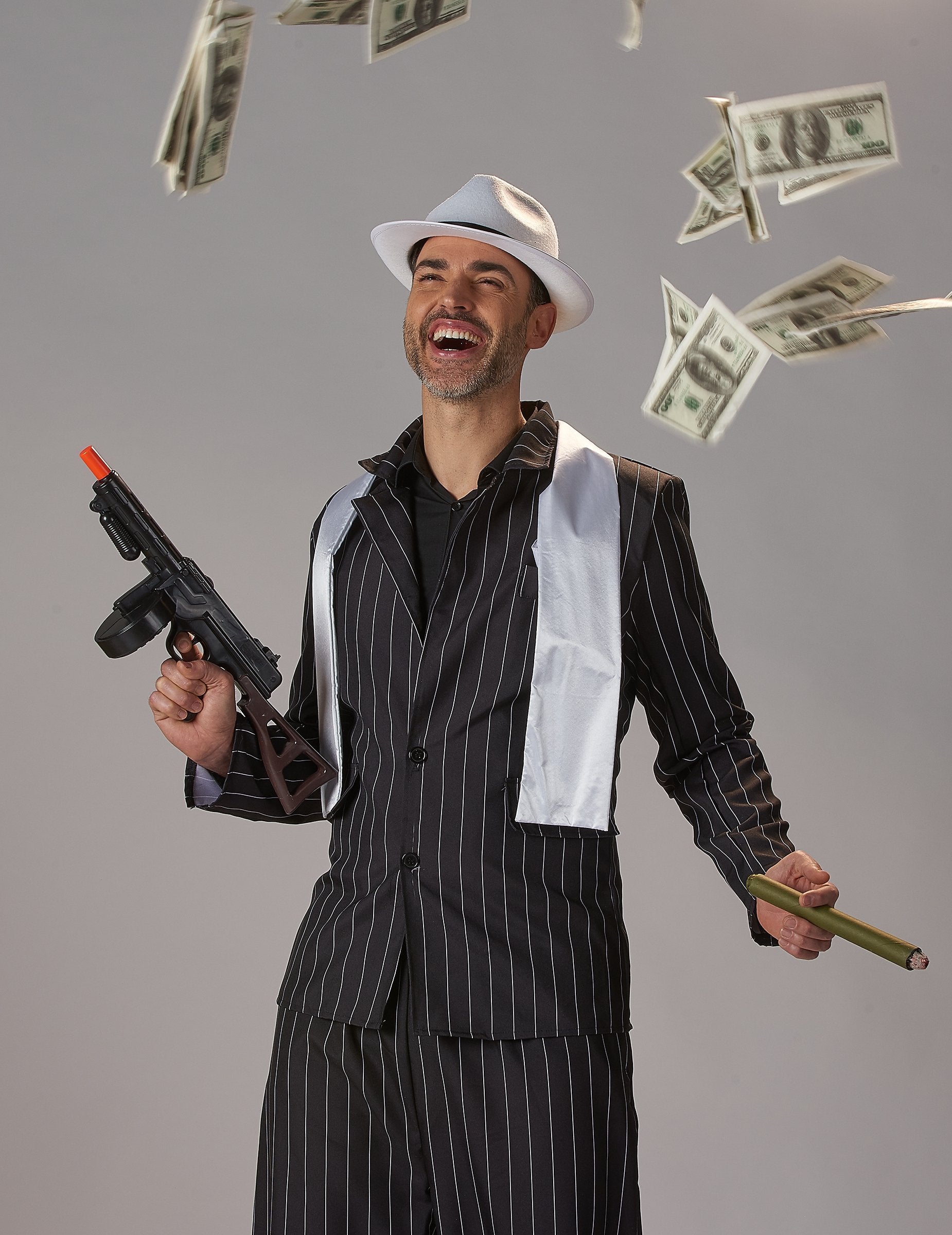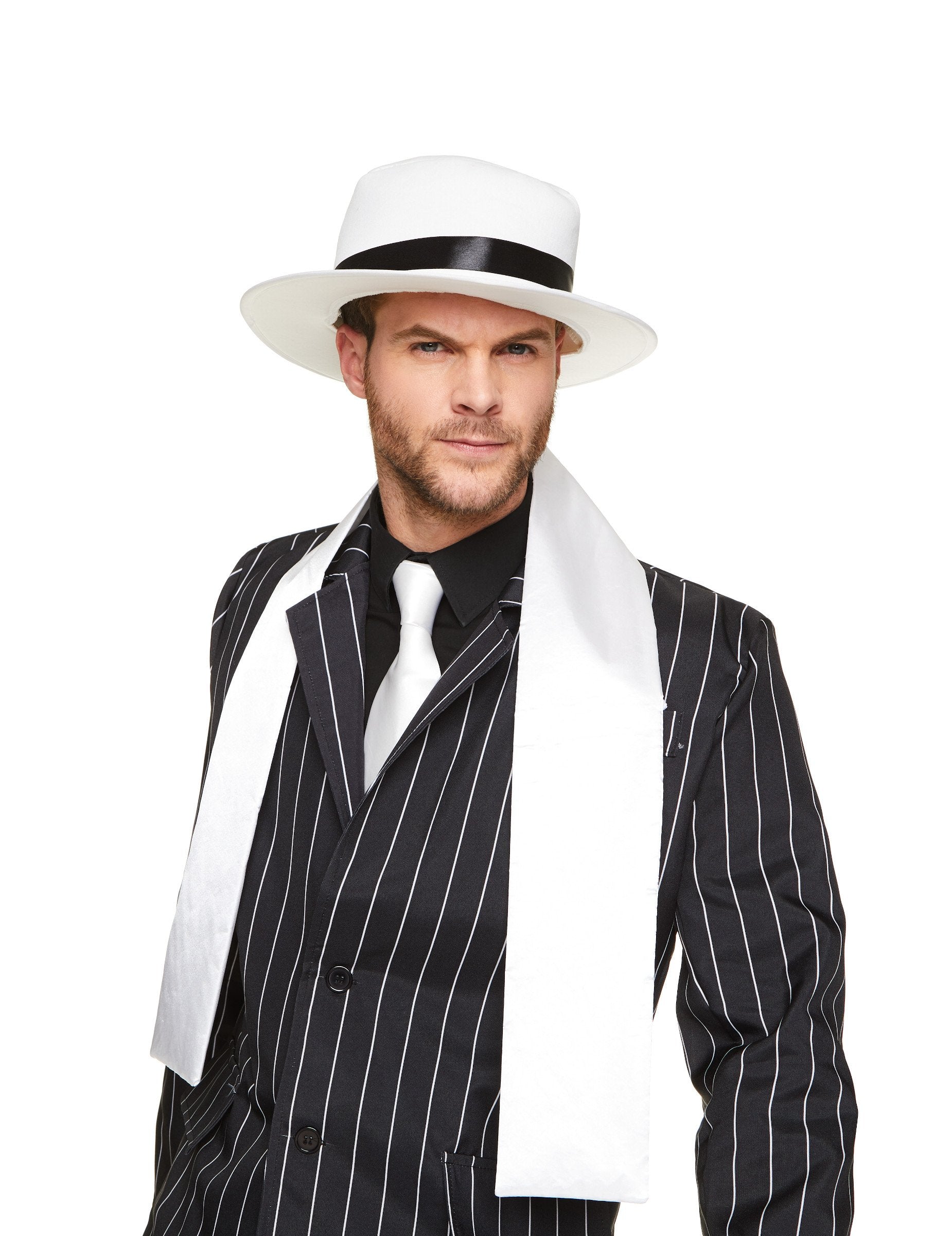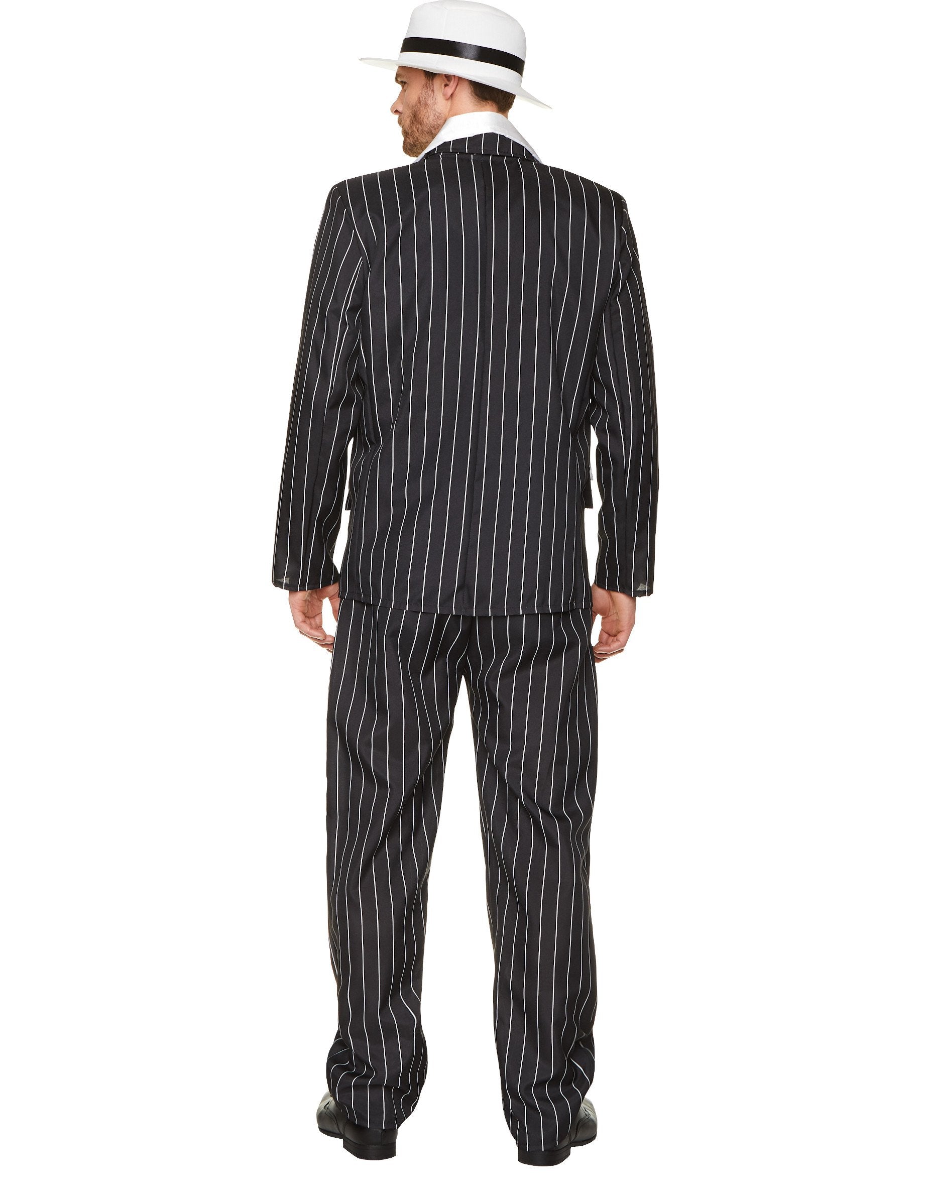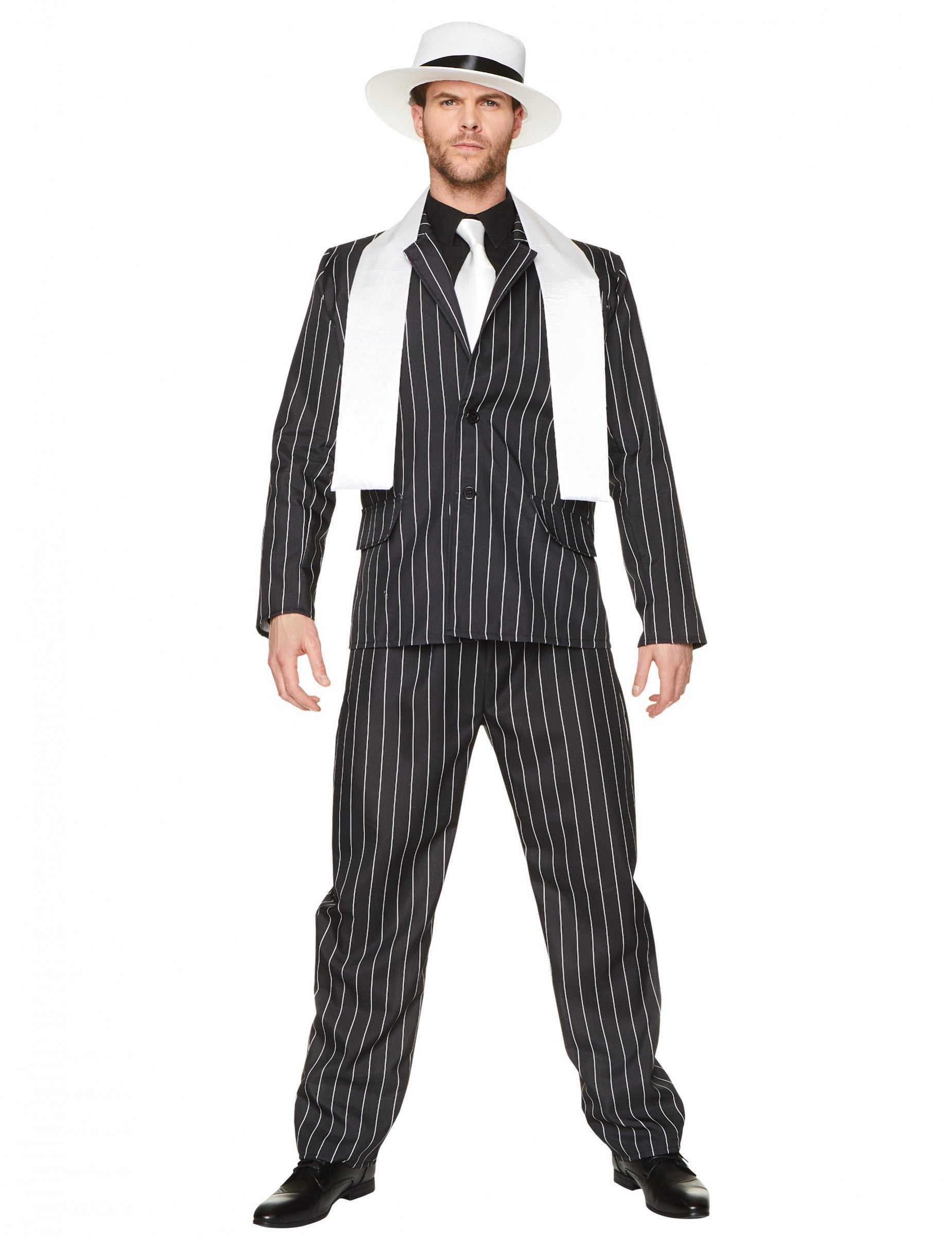 Ovaj muški gangsterski kostim sastoji se od jakne, hlača, šešira i šal. Jakna i hlače izrađene su u istoj crnoj tkanini s tankim bijelim prugama. Jakna ima lažne džepove na prednjoj strani, a zatvara se sprijeda pomoću 2 gumba. Hlače su elastične u struku. Šešir od pjene je bijeli, s crnom satenskom trakom u bazi. Konačno, kratki satenski bijeli šal dovršit će ovaj kostim. Ovaj će kostim biti savršen za vas za pravog gangstera povodom večeri na temu 1930 -ih.