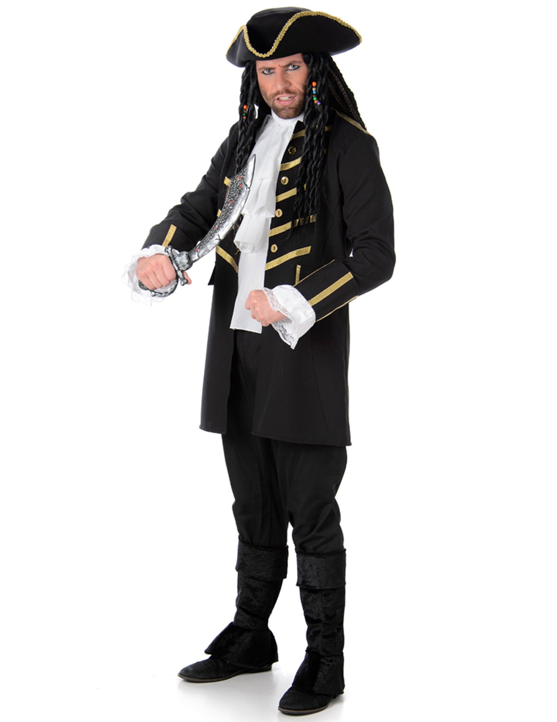 Ovaj gusar prerušen za muškarce sastoji se od jakne, usjeva, šešira i kičlanih pijaka (vrh, mač, hlače i cipele nisu uključeni). Duga jakna je crna i zlatna. U sredini ima zlatne plastične gumbe. Bijela čipka prisutna je na zglobovima. Usjev je izrađen od bijelih rufa. Zatvara se u vratu ogrebotinama. Ovaj usjev je dug, srušit će se na poprsje. Možete ga vezati u struku tako da ostane dobro riješen. Tricorne je crna sa zlatnom granicom. Dreadlocks pletenice fiksiraju se na ovom šeširu. Konačno, Sur-Chicts su crne u baršunastom efektu tkanine. Održavaju se pod nogama elastikom. Ovaj kompletni kostim bit će savršen za to što je najtiskiji gusar mora.