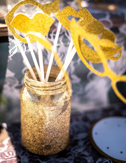 Ovaj zlatni komplet Photobooth sastoji se od 9 kartona, montiranih na bijeli štap. Ovaj se komplet sastoji na sljedeći način: - 3 usta - 3 brkova - 3 para naočala Ovaj komplet će biti savršen za izradu fotoboljičke animacije tijekom rođendanske zabave ili vjenčanja.