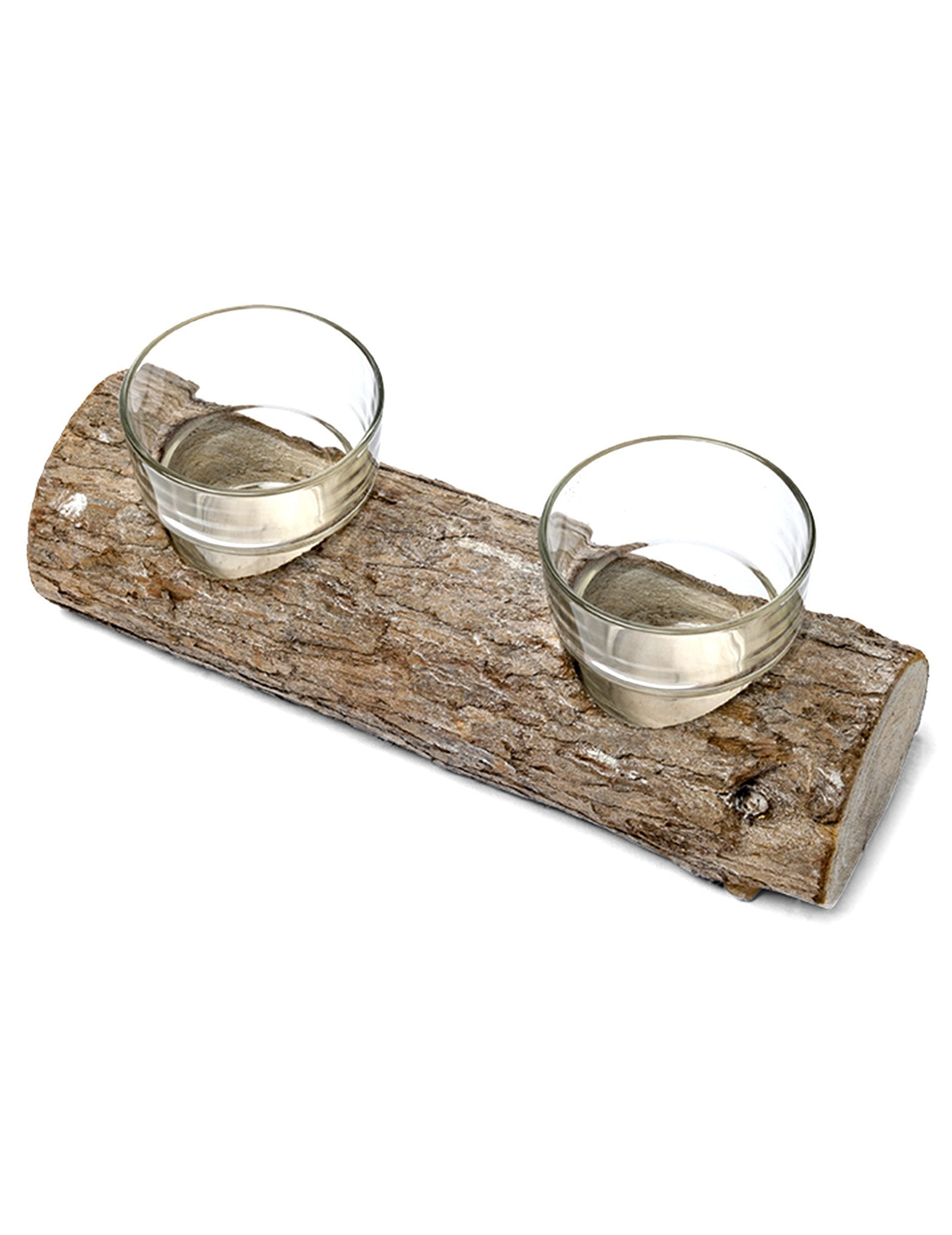 Ovaj veličanstveni držač svijeća sastoji se od stvarnog malog drvenog trupaca i dva staklena fotofora. Drveni trupac je duljina otprilike 21 cm i ima dva ureza kako bi primili fotofore. Male naočale mjere oko 6 x 6 cm. Unutra možete postaviti mali grijač cipela. Ovaj vrhunski rustikalni držač svijeća bit će savršen za ukrašavanje središta vašeg stola tijekom zimske večeri ili za romantični ukras za vaše vjenčanje. Prirodni proizvod koji može imati nesavršenosti (različita nijansa, čvorovi u drvetu, kore koja se ističe).